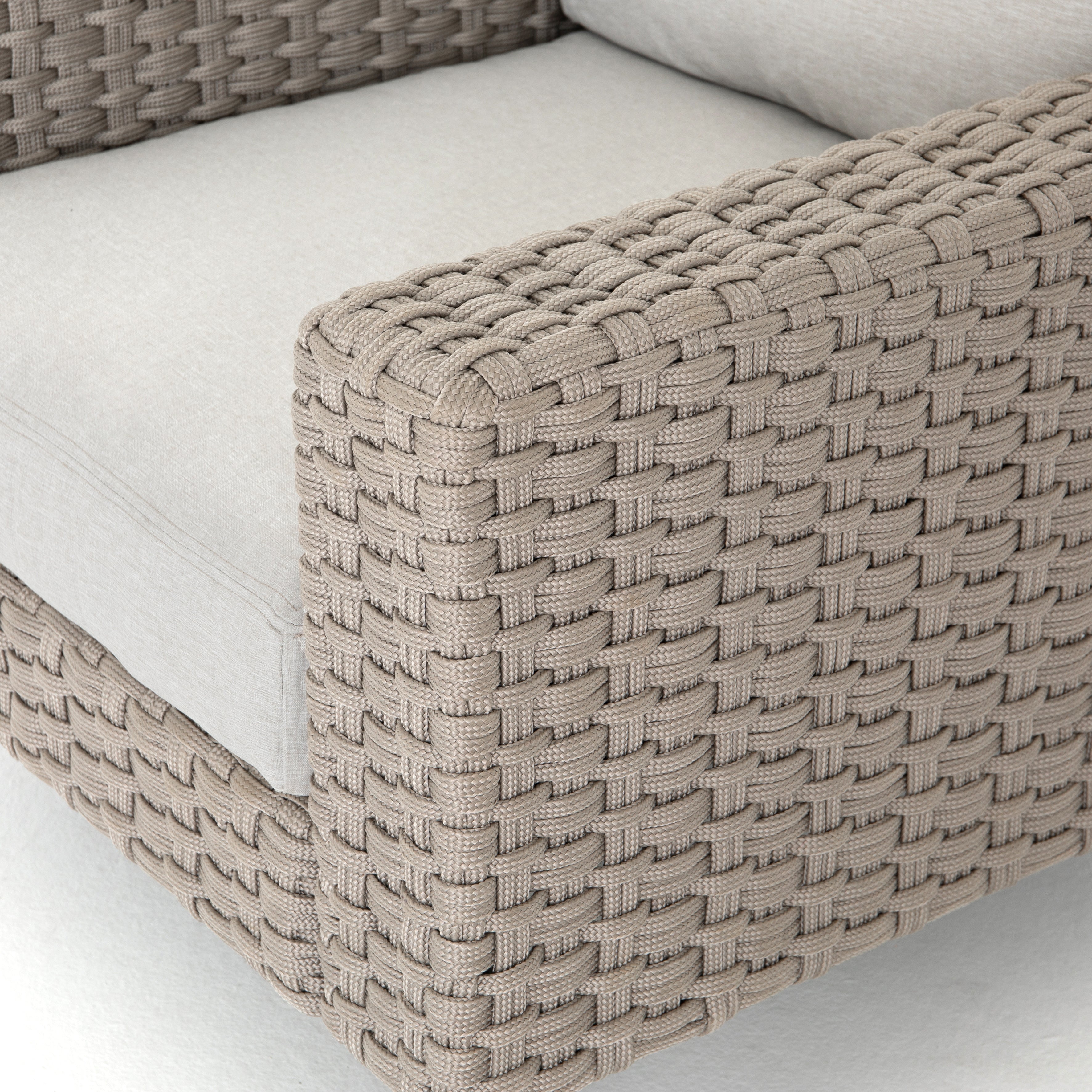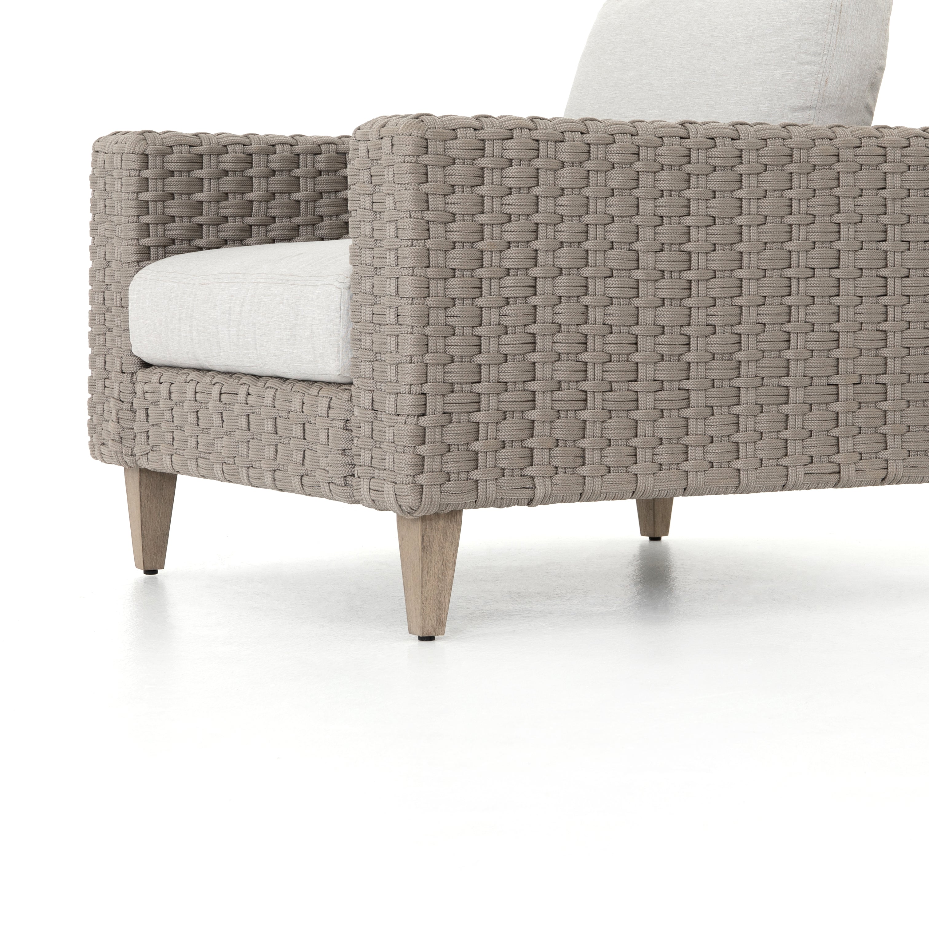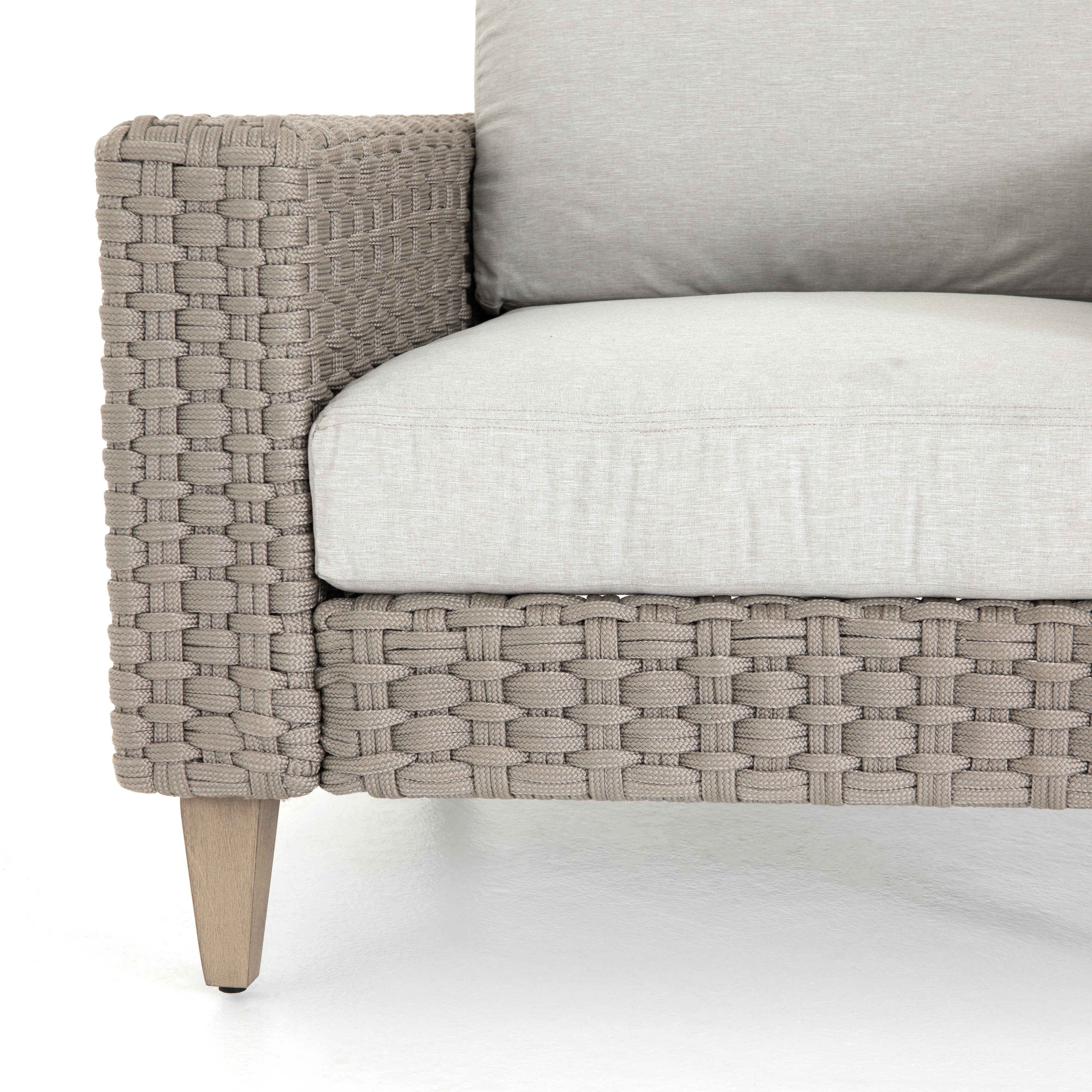 A low, textural take on outdoor seating, light grey rope weaving frames soft, durable stone-colored cushioning. Cone-tapered teak legs for a shapely finishing touch. Safe for outdoor spaces. Cover or store indoors during inclement weather and when not in use.