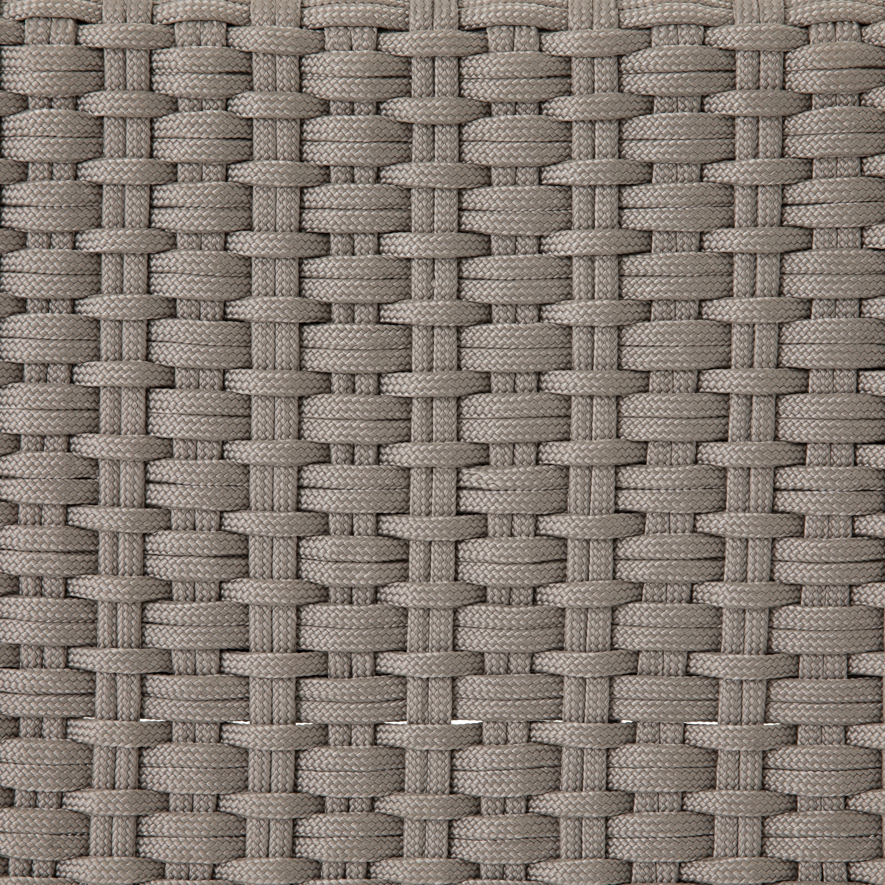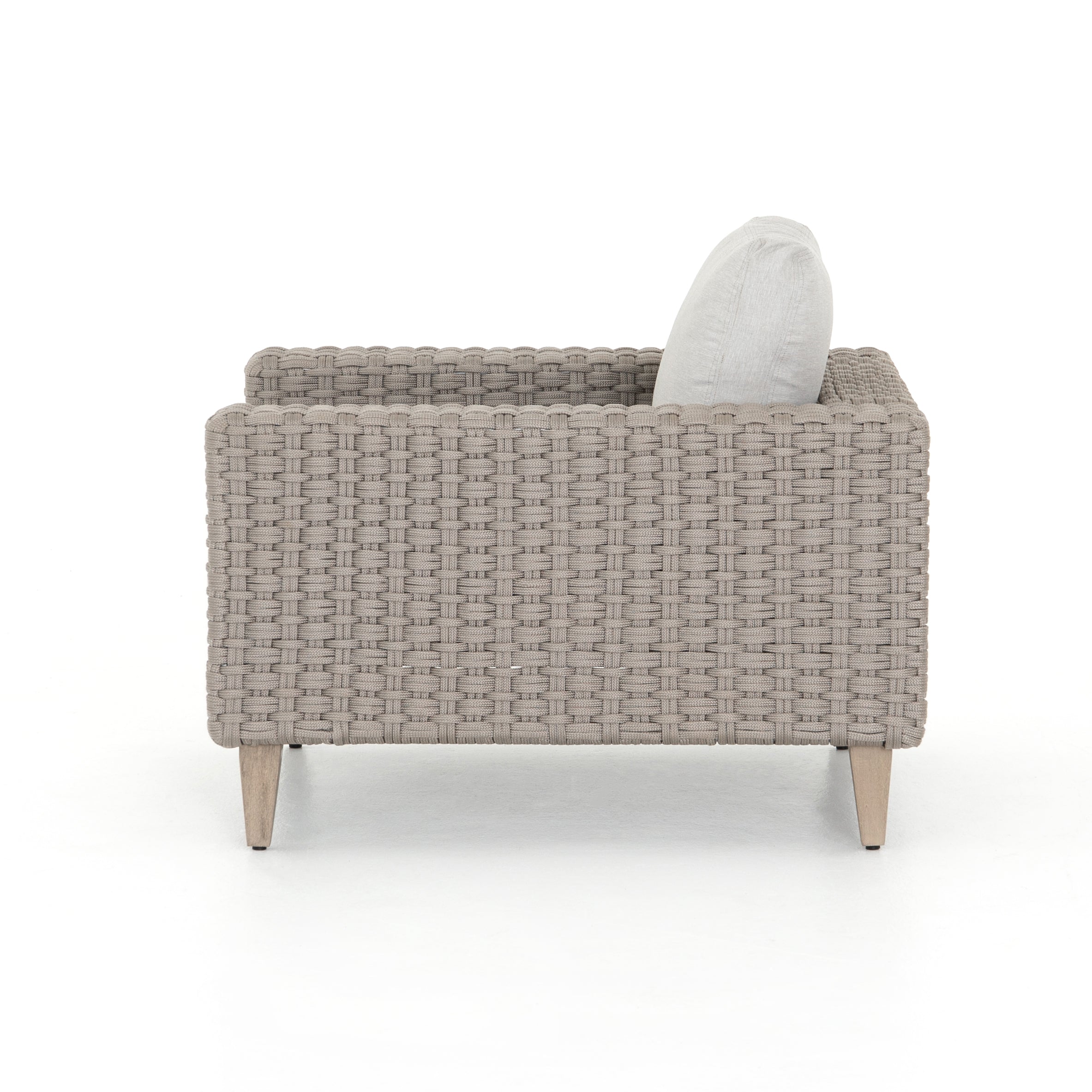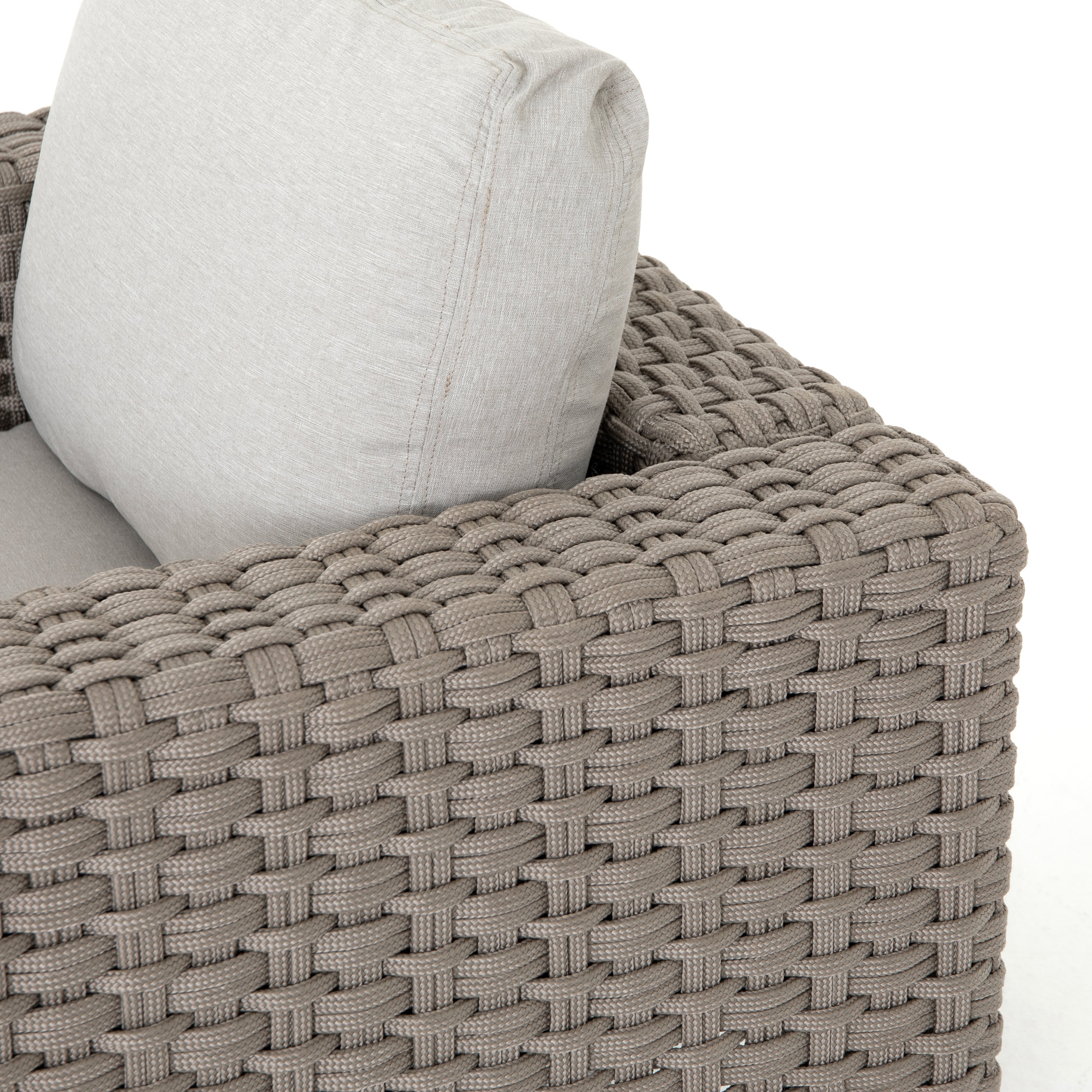 A low, textural take on outdoor seating, light grey rope weaving frames soft, durable stone-colored cushioning. Cone-tapered teak legs for a shapely finishing touch. Safe for outdoor spaces. Cover or store indoors during inclement weather and when not in use.