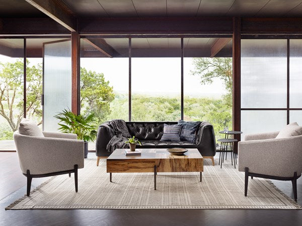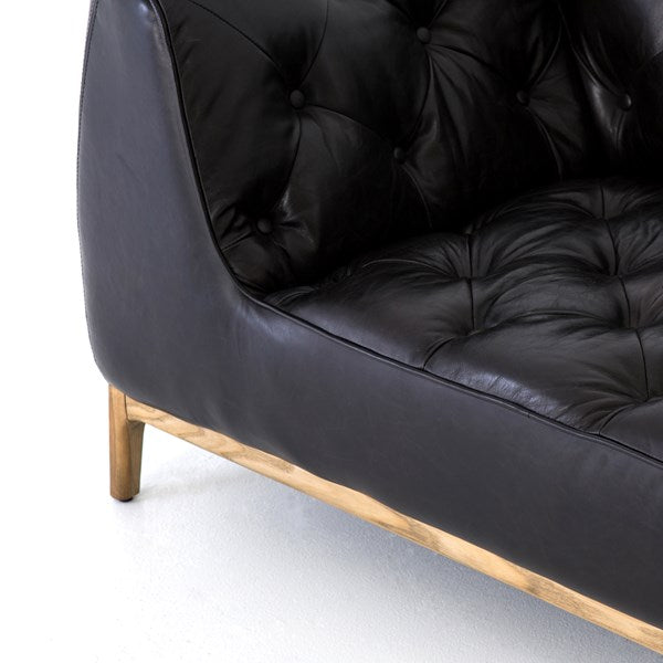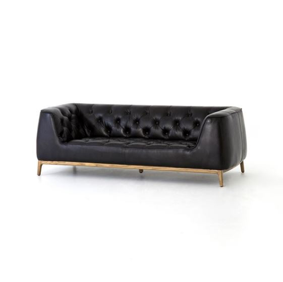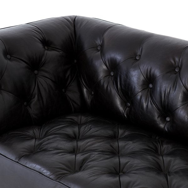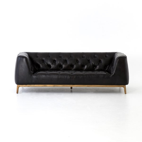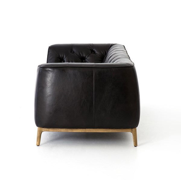 A contemporary spin on the classic Chesterfield sofa. Raw, black top-grain leather features deep tufting and low styling for an inviting look. Ash legs of weathered oak stay stout to let leather stand front and center.