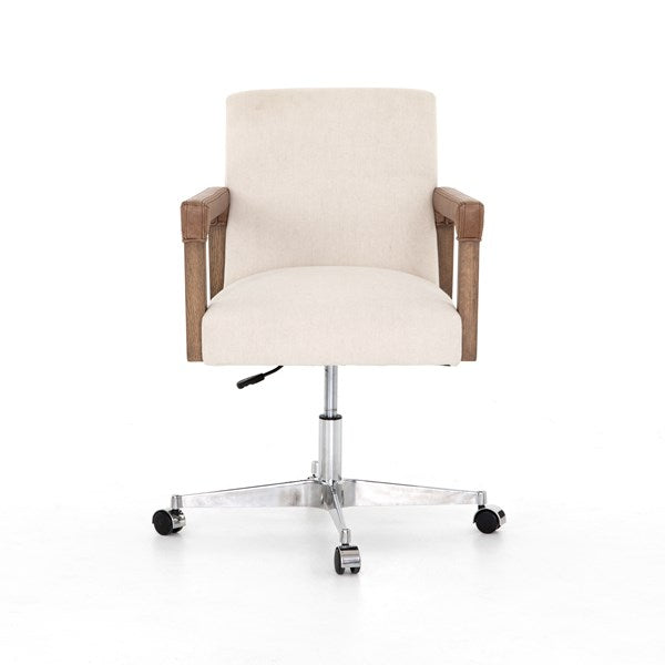 Elegance is no exaggeration. Slim, tapered oak arms with leather-wrapped arms frames a floating seat of cotton/linen blend in a natural off white. Adjustable swivel base for modern ease, perfect in the workplace or home office.