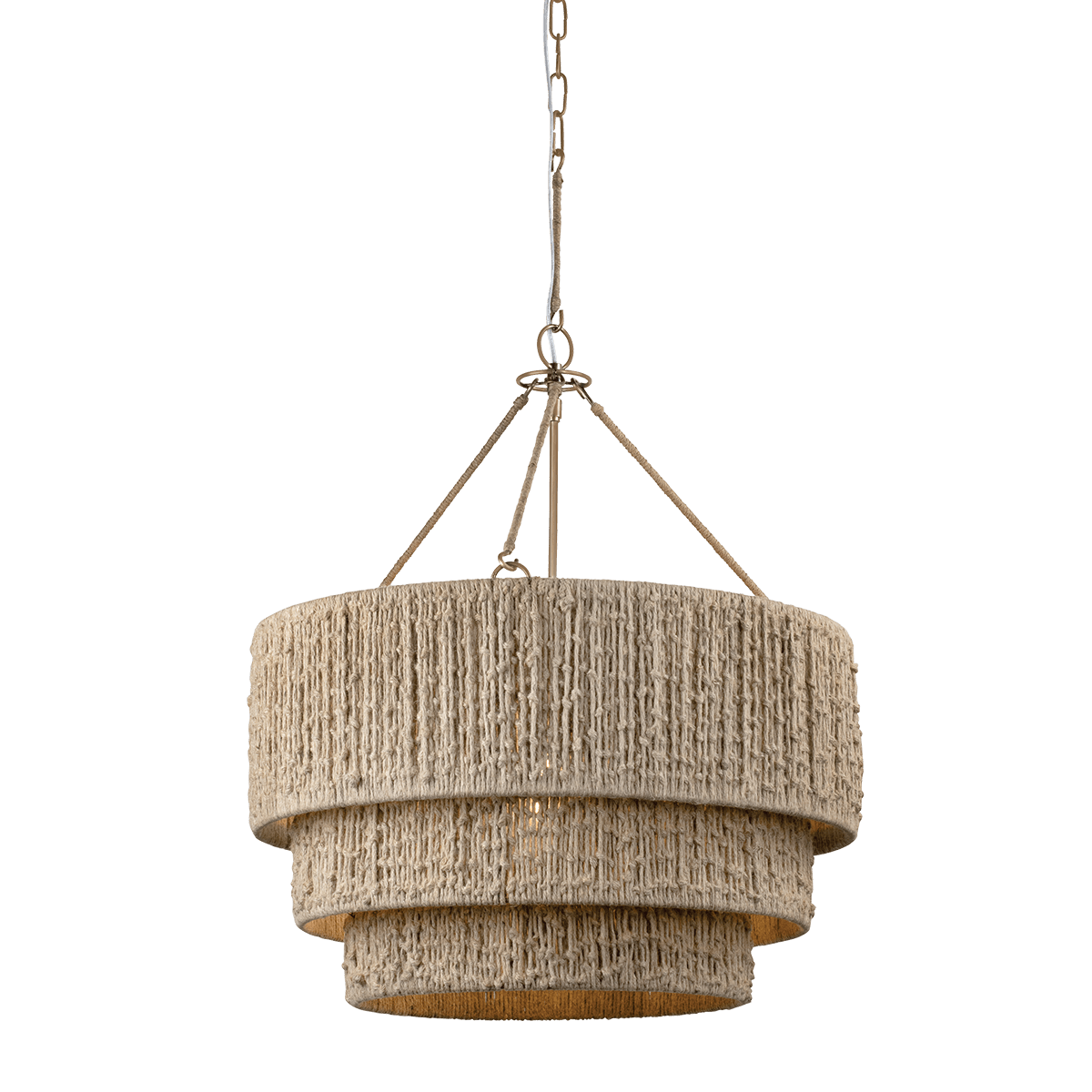The Reza chandelier features a familiar silhouette of a drum shade that is magnified and multiplied. Made from wrapped jute string, the cascading shades showcase a rich materiality and authentic handicraft, enhanced by three string suspension cords. The antiqued Patina Brass finish blends seamlessly with earthy palettes, casting a warm glow that evokes nostalgia. This chandelier is designed for versatility, appealing to both traditional and contemporary spaces.