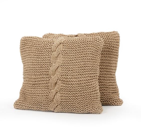 Toss in some texture, indoors or out. Made entirely from recycled materials, a chunky knit and center braid make a two-pillow set of throw pillows the perfect finishing touches to outdoor seating. Store inside during inclement weather.
