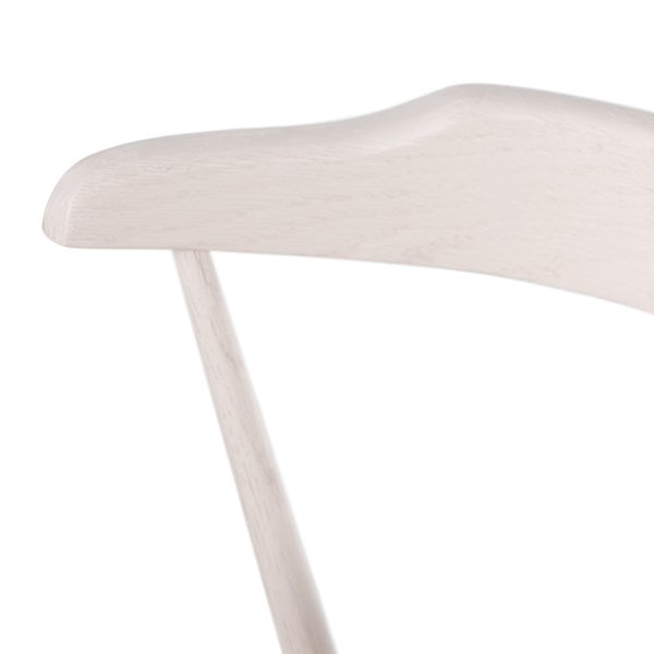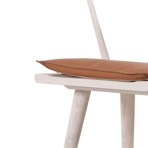 A modern take on the traditional mid-century Windsor, featuring an off-white finish and sculptural oak silhouette. Meanwhile, a loose seat cushion of tan top-grain leather works comfort and contrast into the mix.