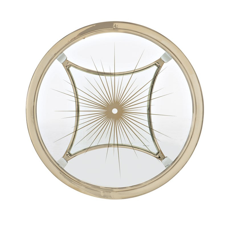 At once classic and chic, this round table is undoubtedly a rising star. A silkscreened starburst pattern in Neutral Metallic highlights its glass top while its metal frame and stretcher shine in a plated Whisper of Gold finish. Like a fine jewel, this stunning piece enhances every interior and is suited to adorn any space. The epitome of classic elegance, it presents a familiar motif modernized with a versatile metallic finish.