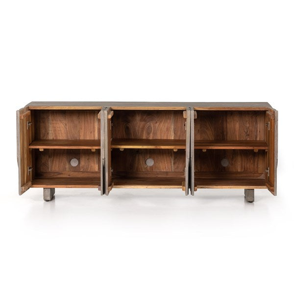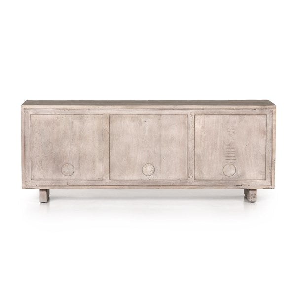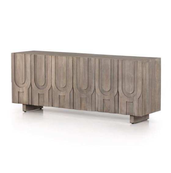 Made from reclaimed woods and finished in an aged grey, specialized carving brings a unique, global look to a roomy media console, with plenty of storage space plus rear cutouts for seamless cord management.