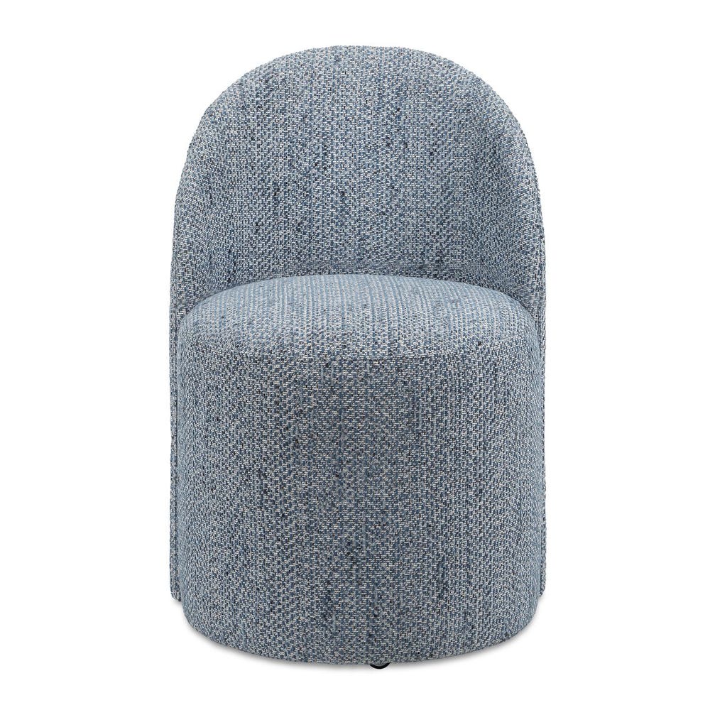The Roll With It dining chair blends classic vanity seating inspiration with modern dining functionality. It features rolling casters for easy mobility and is fully upholstered in a textured woven chenille fabric in denim and white tones. This chair measures 22 inches wide, 32 inches high, and 23 inches deep, offering comfortable seating with an 18.5 inch seat height.