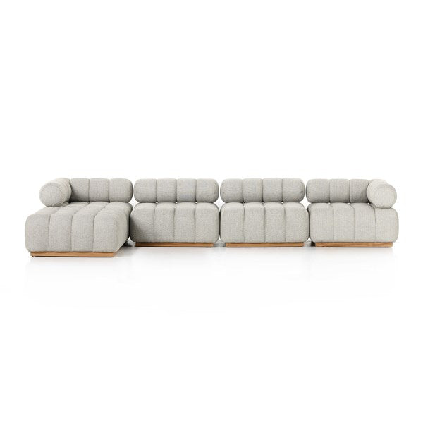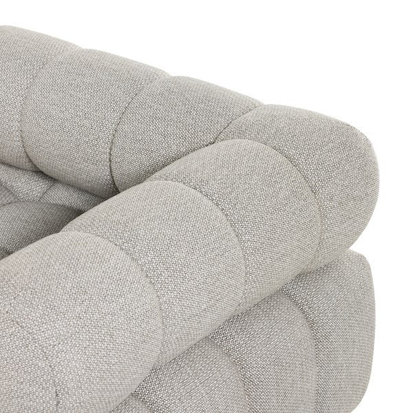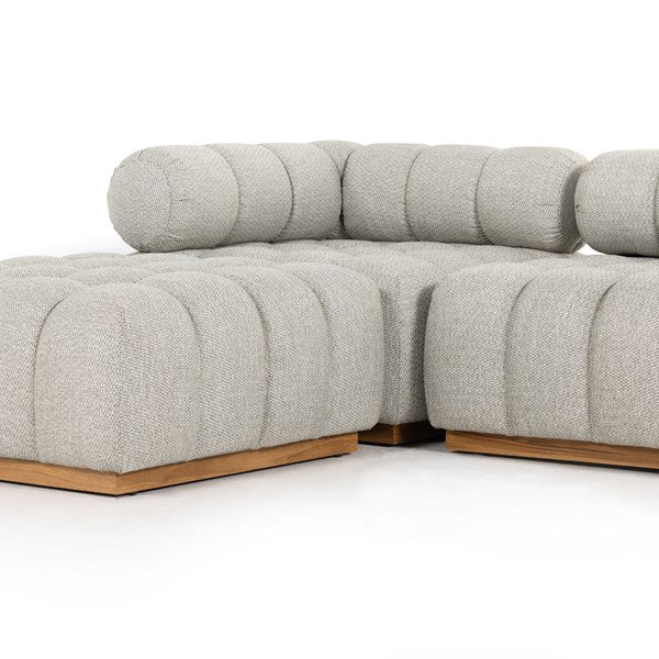 A modern take on mid-century Italian design, soft volume and exaggerated proportions fuse for a sculpted look and playful feel. Atop a plinth-style teak base, outdoor-friendly seating features dramatic tufting for a padded sit, with a matching ottoman to complete the look. Cover or store inside during inclement weather and when not in use.
