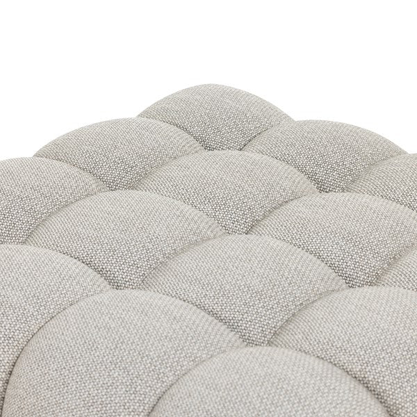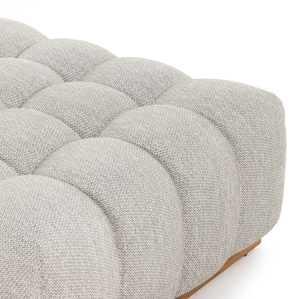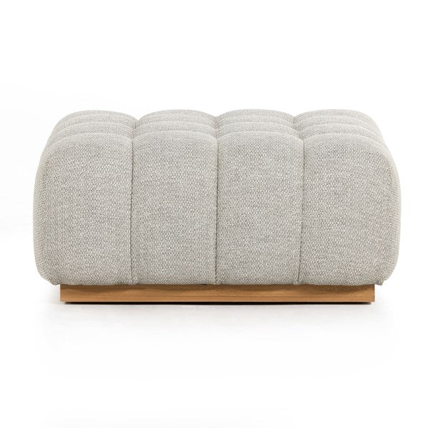 A modern take on mid-century Italian design, soft volume and exaggerated proportions fuse for a sculpted look and playful feel. Atop a plinth-style teak base, outdoor-friendly seating features dramatic tufting for a padded sit, indoors and out. Ottoman to matching sectional. Cover or store inside during inclement weather and when not in use.