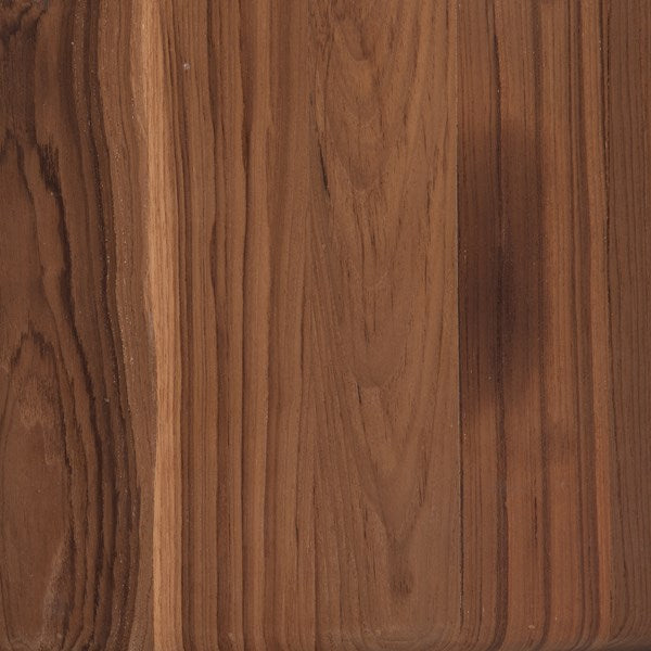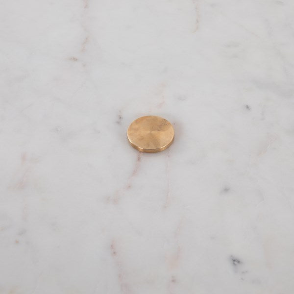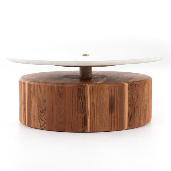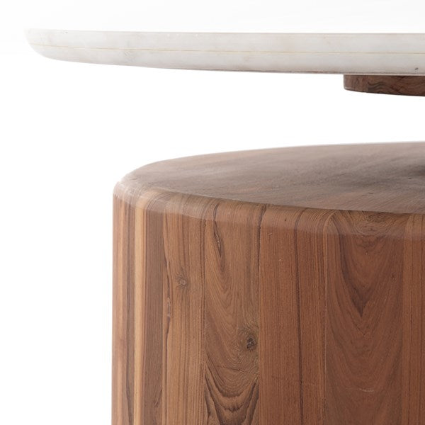 Shape-driven style with a mid-century spin. A thick, rounded base of natural reclaimed teak supports a floating tabletop of honed white marble, connected by raw brass hardware.