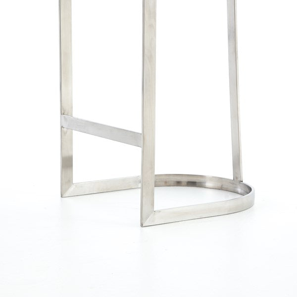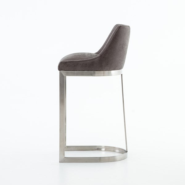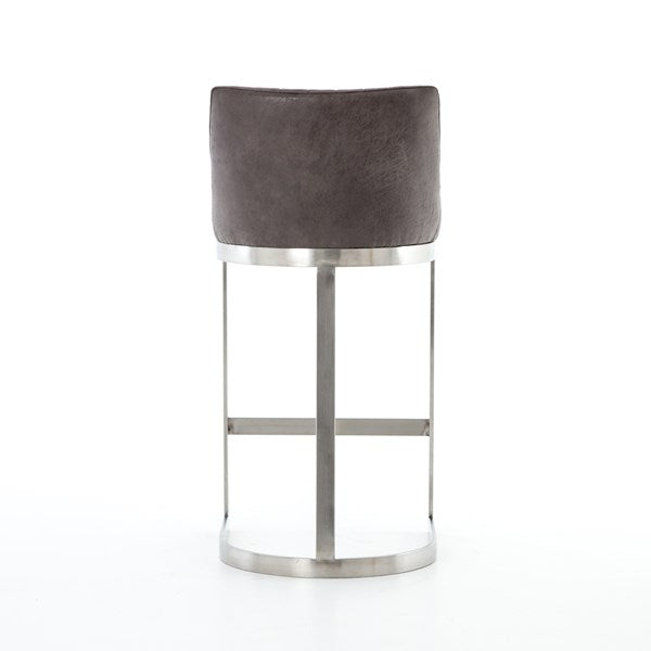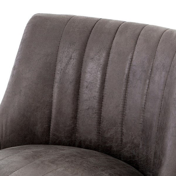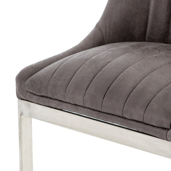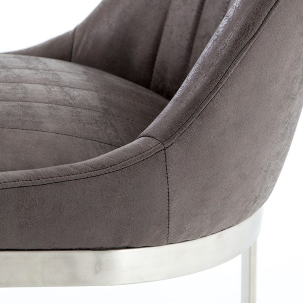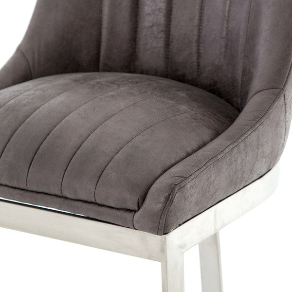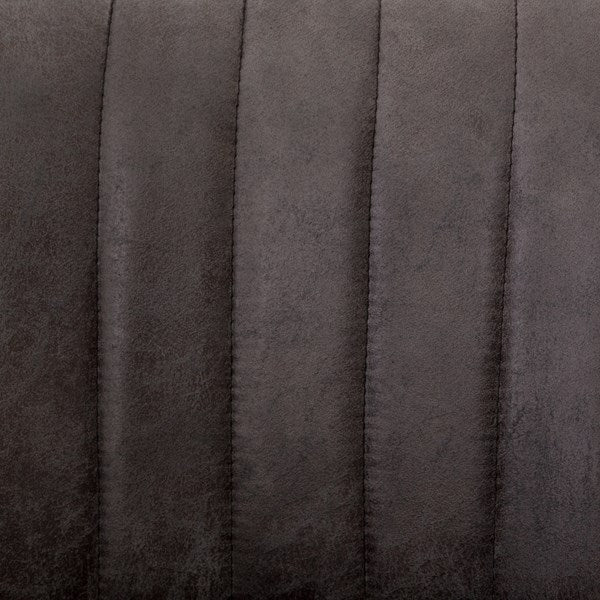 Vintage glamour gains modern presence. Stainless steel legs shape a classic U base. Rich faux leather adopts a graphite tone to welcome dramatic vertical channel tufting - the perfect pairing of throwback lounge style and fresh sophistication.