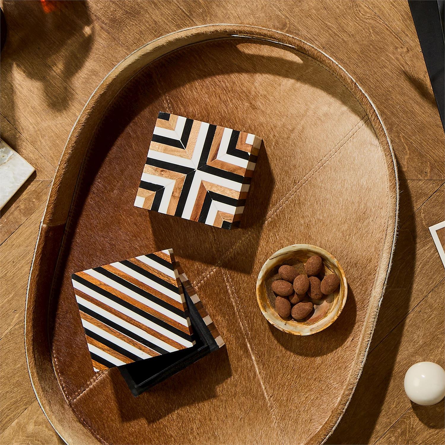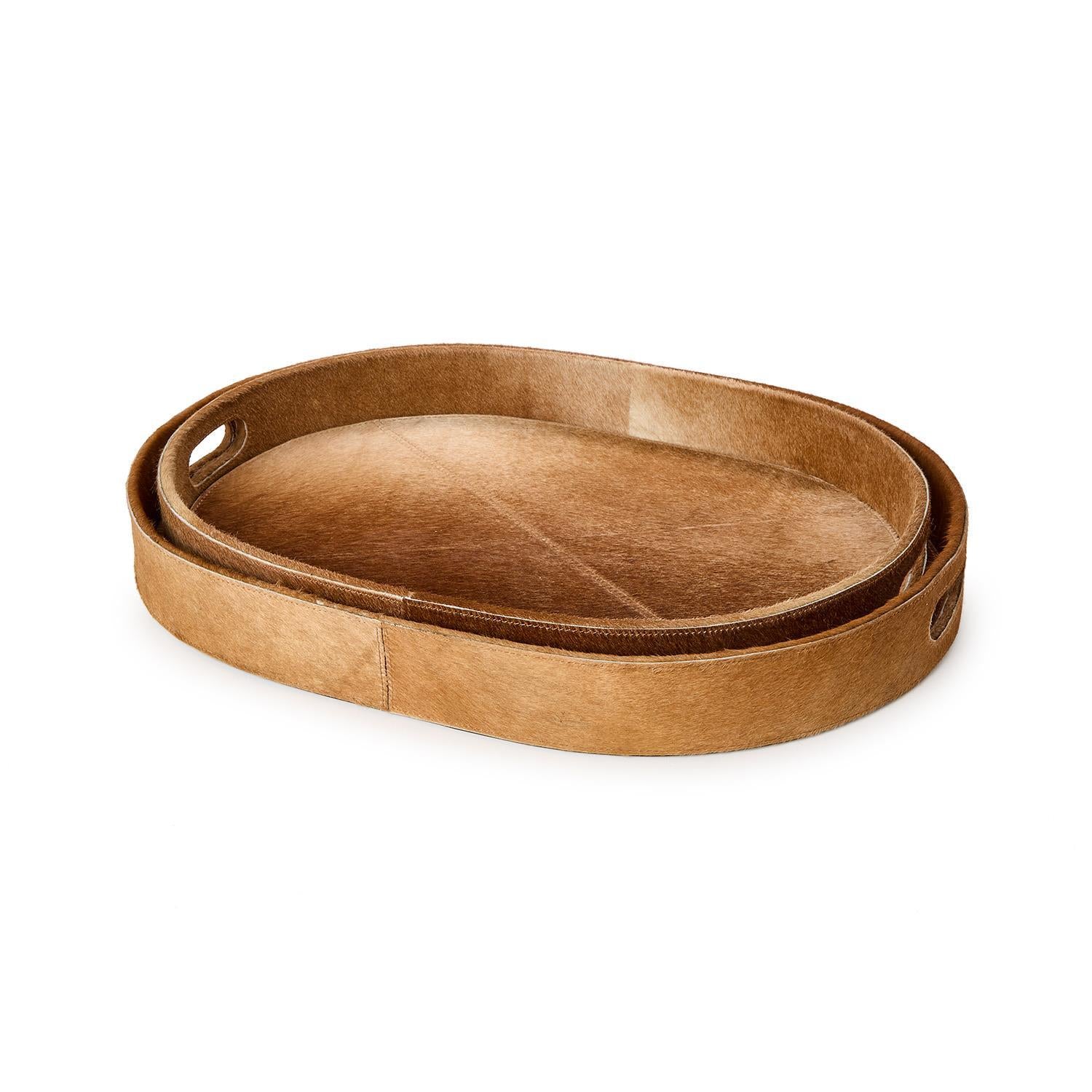 Elevate your space with the Jasper Set of 2 Cowhide Brown Trays. Crafted with a natural cowhide and sturdy MDF, these trays are a perfect blend of rustic charm and modern elegance. Whether used for serving drinks, displaying accents, or organizing essentials, these trays add a touch of sophistication to any setting.