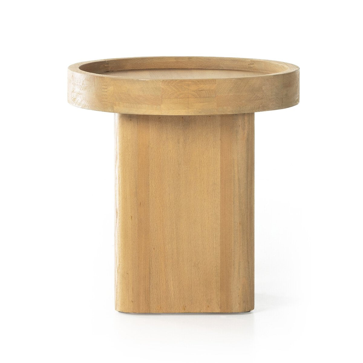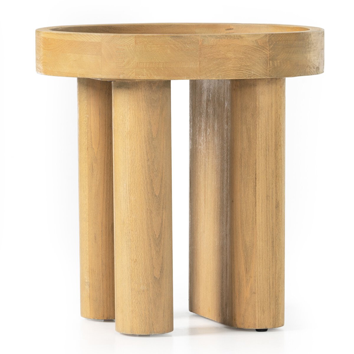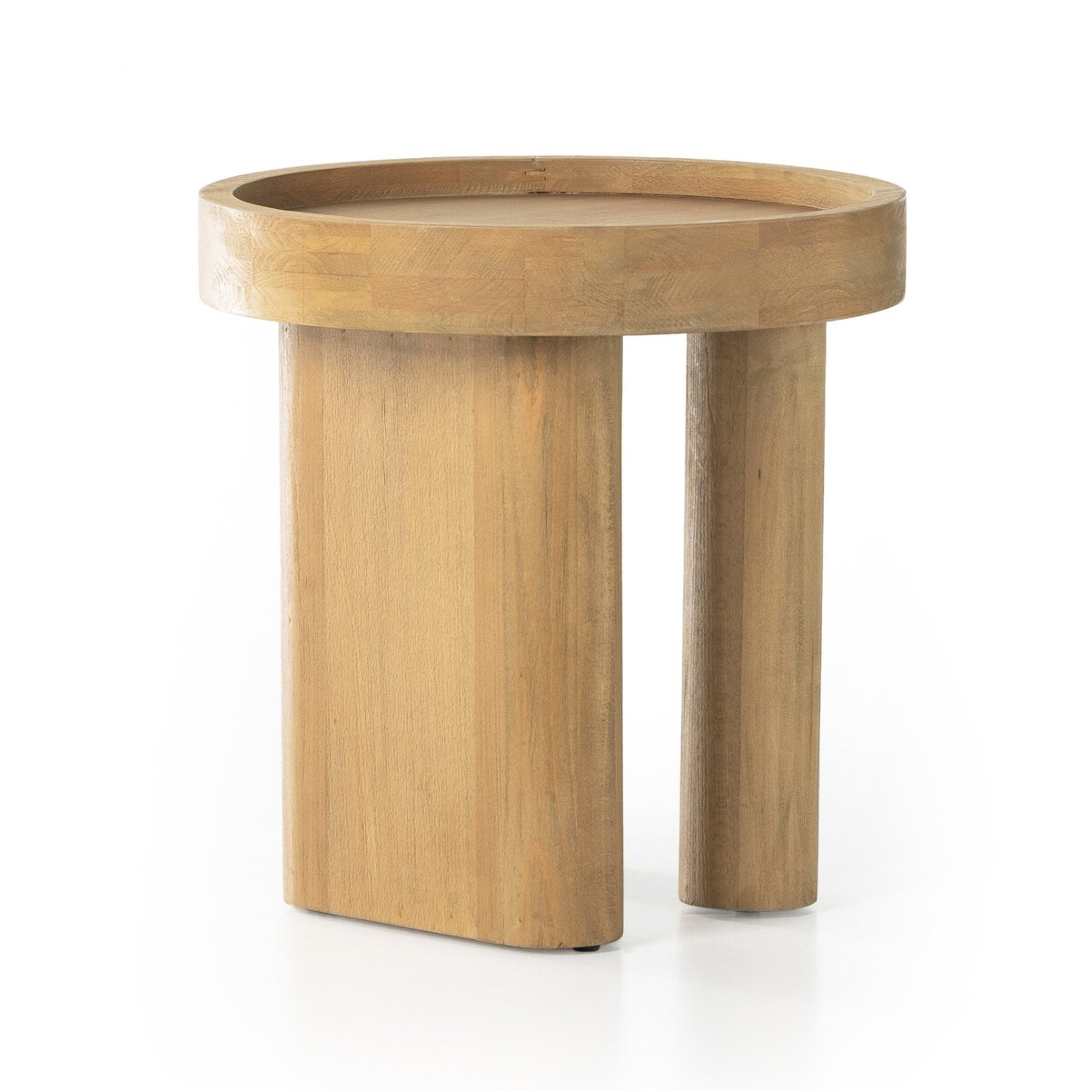 Solid beechwood forms one solid panel frame on one side and dual cylinder legs on the other, for an asymmetric look with balance. Perfectly sized to keep a favorite drink or book within reach.