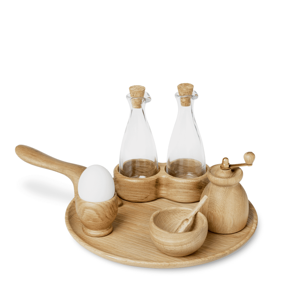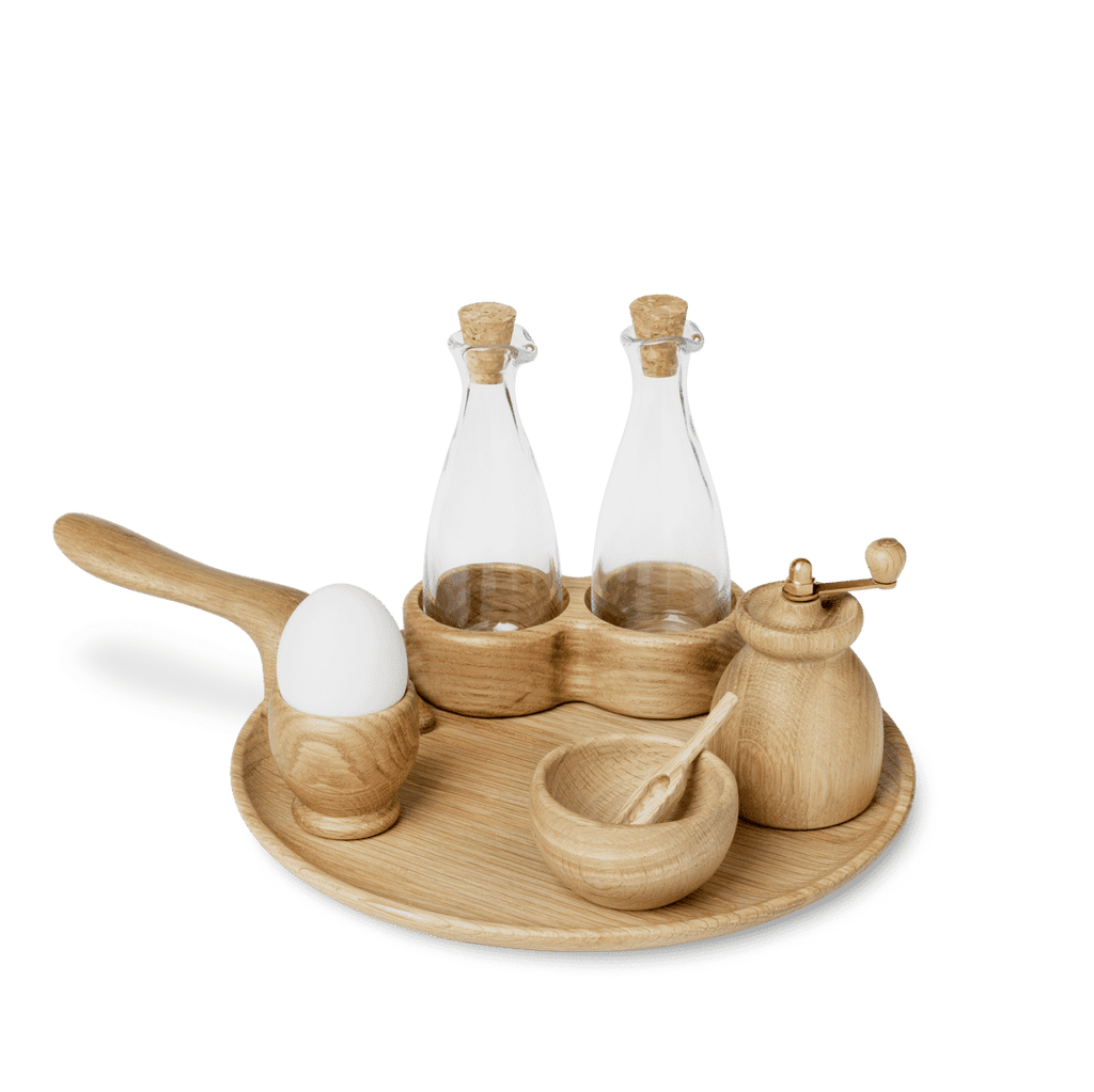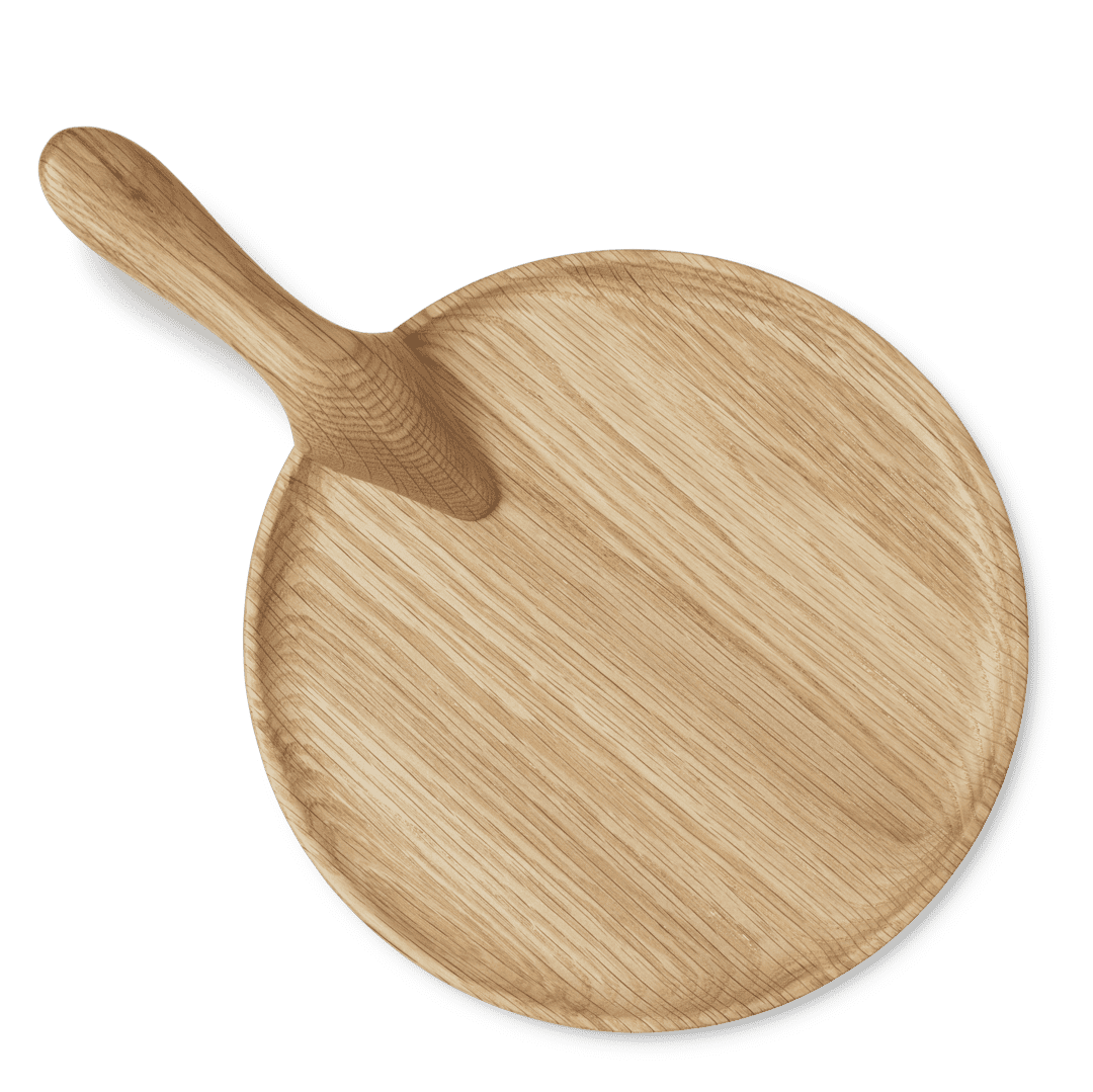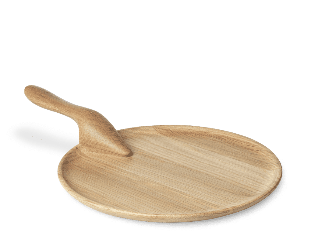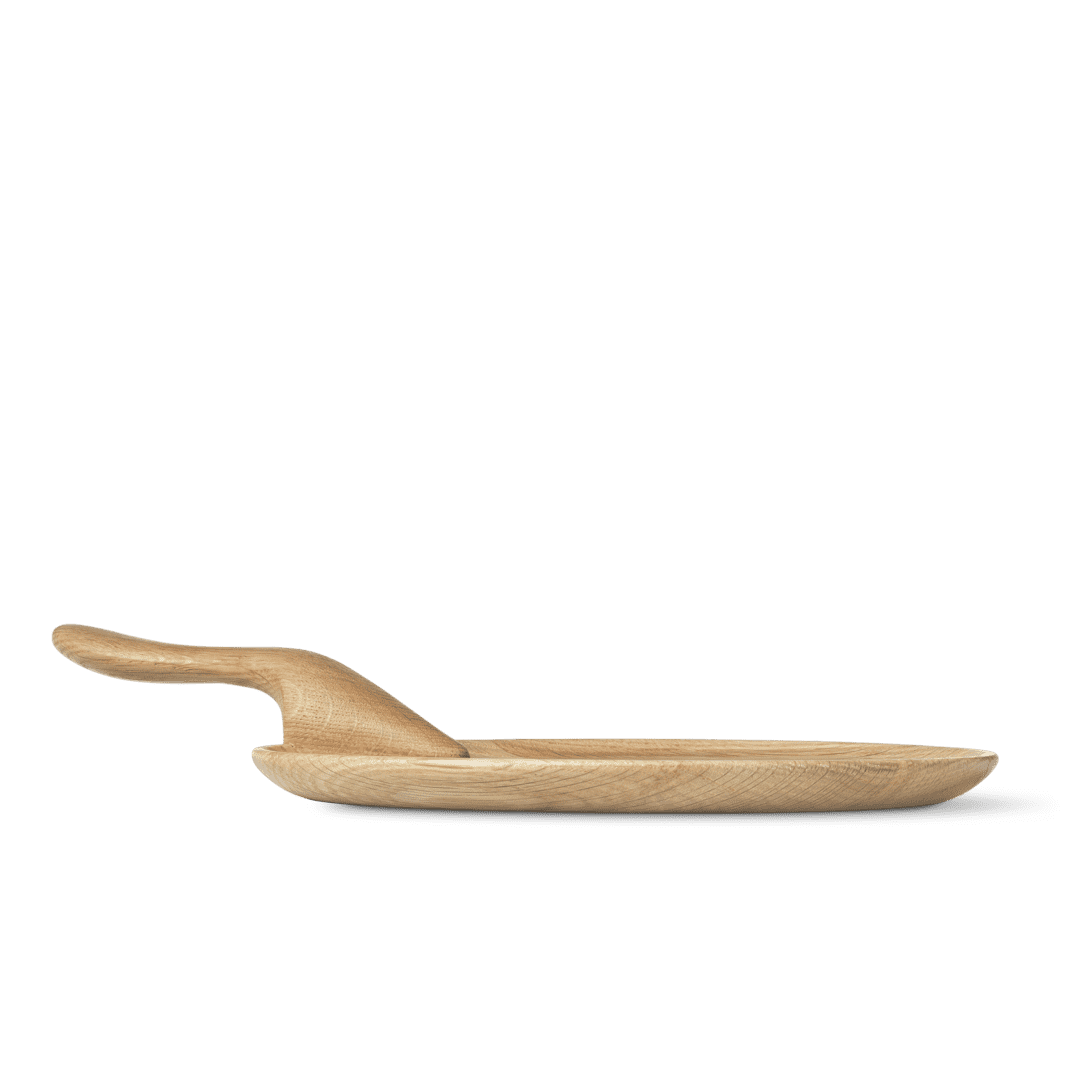Elegant oak serving platter from Kay Bojesen's Menageri range. It is 9.6" in diameter and has an attractive, organic handle that sits nicely in your hand as you serve. The platter unites all the parts of the Menageri range and can be used as a plat-de-menage. The platter can also be used as a serving dish, e.g. for cold cuts or fruit, as it has a food-grade finish, which ensures the wood is not susceptible to food stains. Please be aware that the platter is not cut-resistant or scratch-proof.
