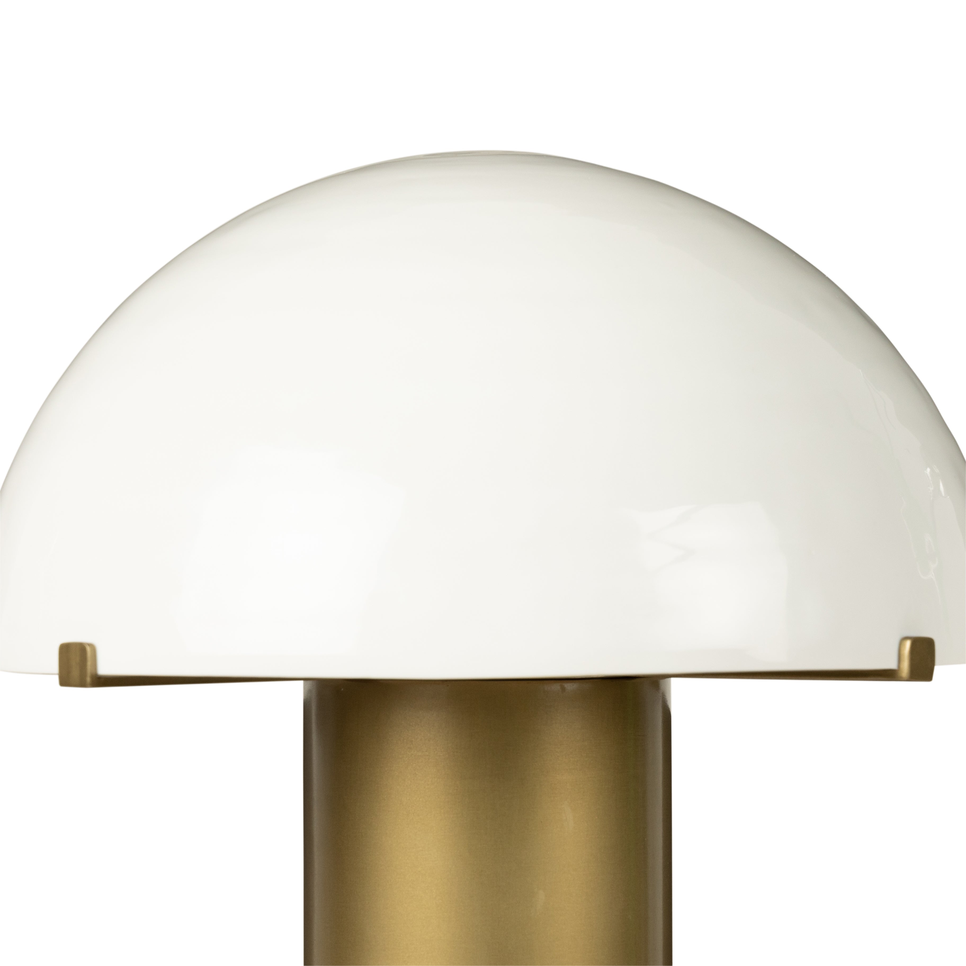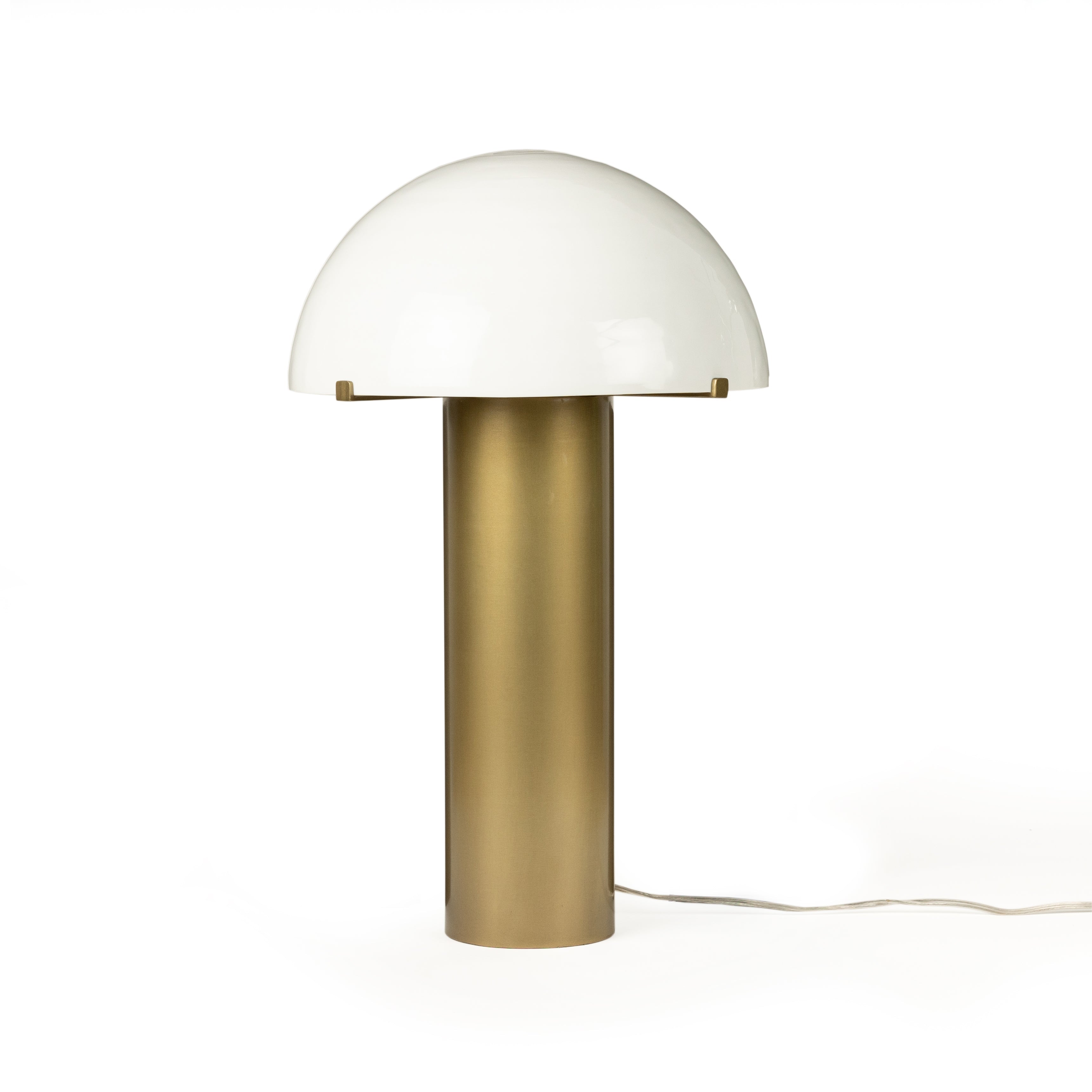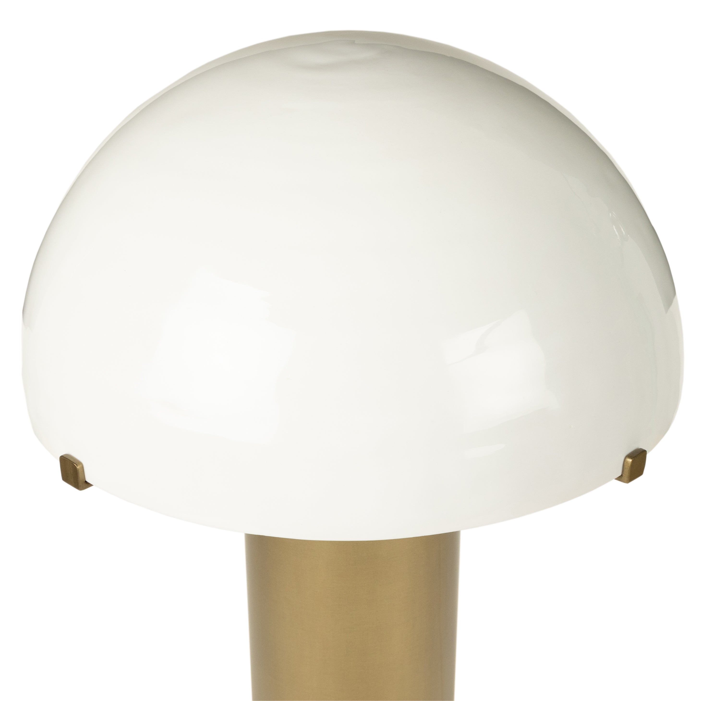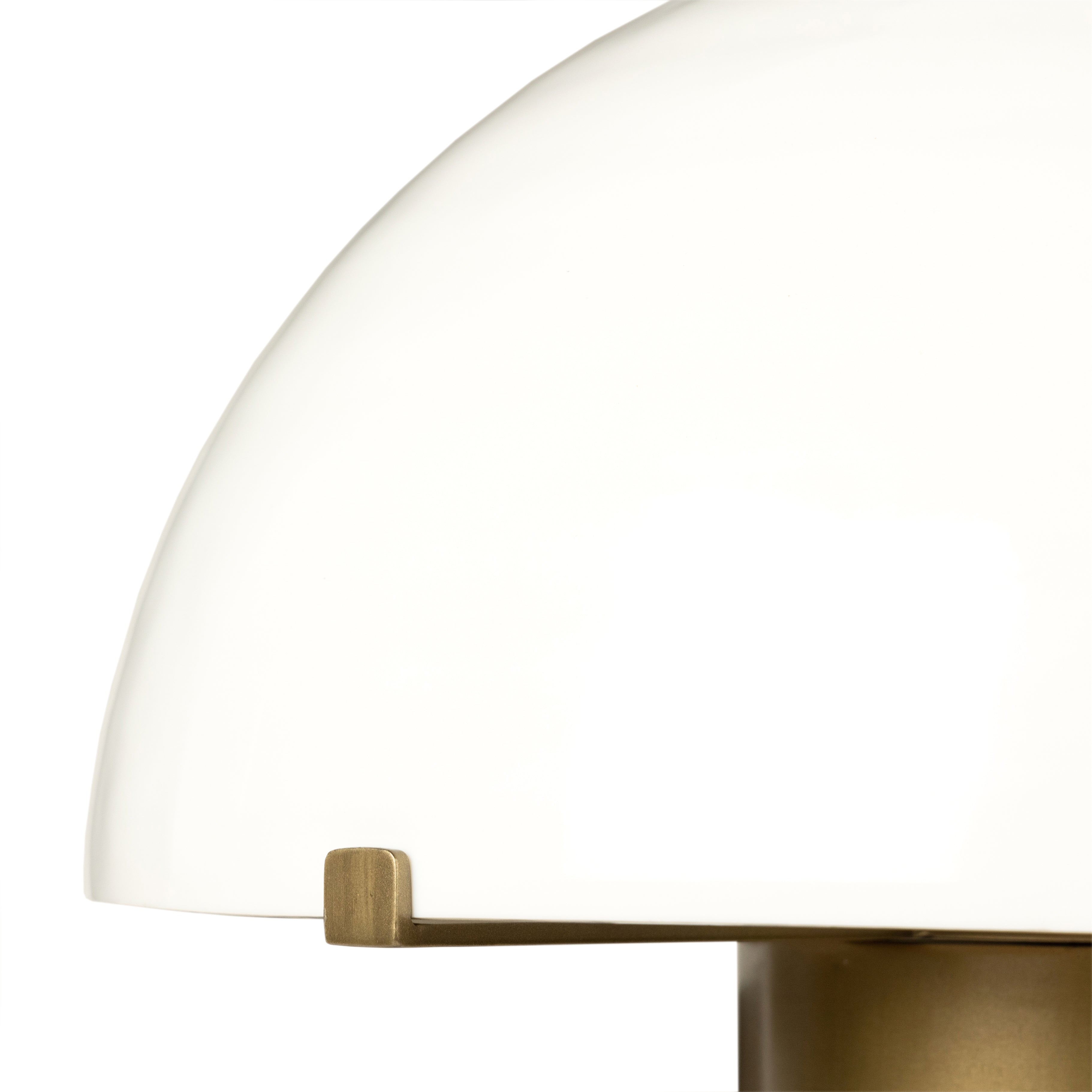 This streamlined table lamp draws upon mid-century modern styles. The antique brass base paired with the milk glass dome shade creates a simple yet unique look.