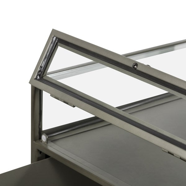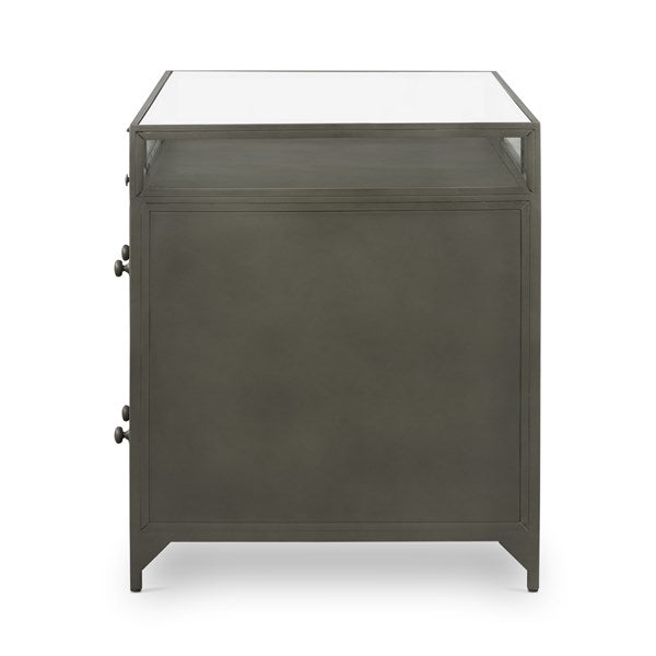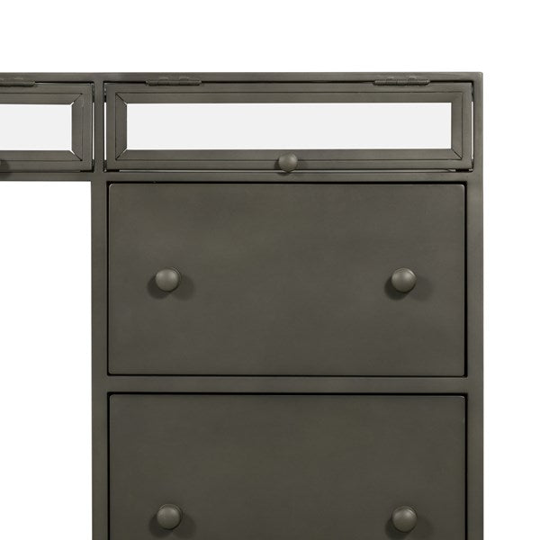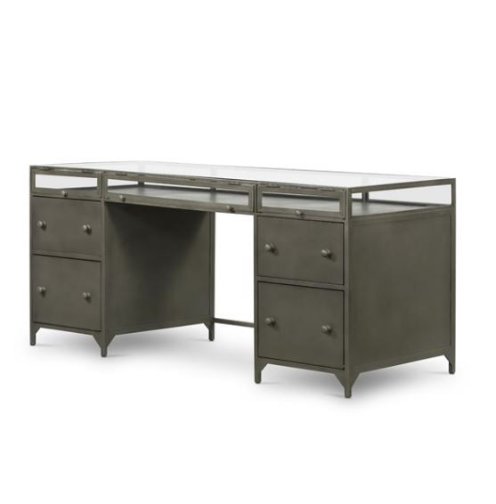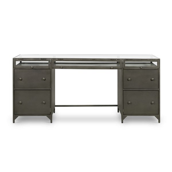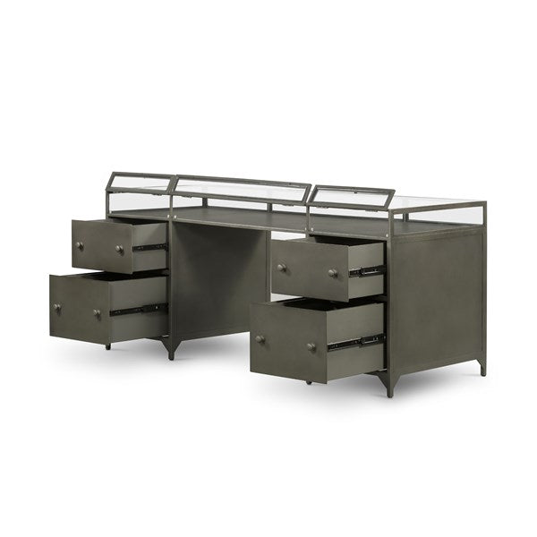 A shadowbox-style desk balances work with play. Display prized possessions in a glass enclosure atop gunmetal-finished iron. Roomy file drawers for handy storage of legal and letter sized documents.