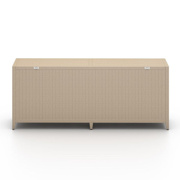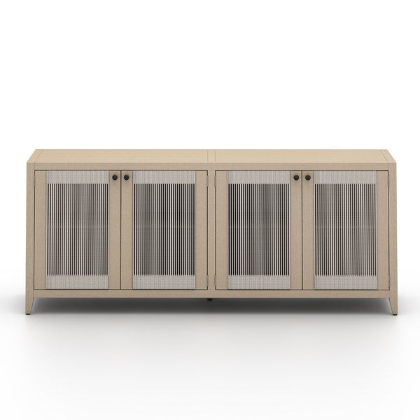 Made from FSC-certified teak finished in a washed brown, an outdoor-friendly sideboard brings storage and style to al fresco entertaining. Grey rope detailing adds a textural touch. Cover or store inside during inclement weather and when not in use.