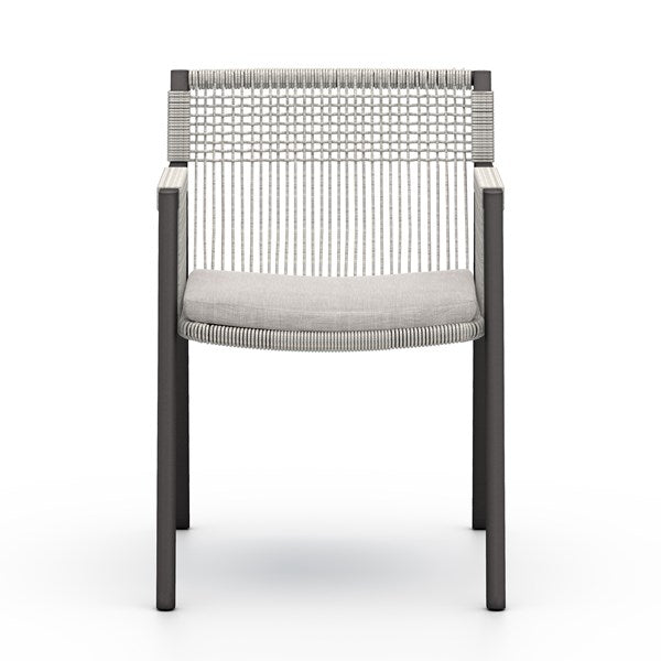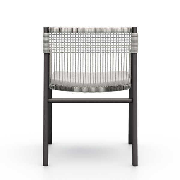 Eyecatching from every angle. Heathered rope is woven at varying widths along the back, sides and arms of this outdoor dining chair for linear detailing all around. Outdoor-friendly aluminum frame with removable seat cushion covered in UV-resistant, water-repellent fabric. Cover or store inside during inclement weather and when not in use.
