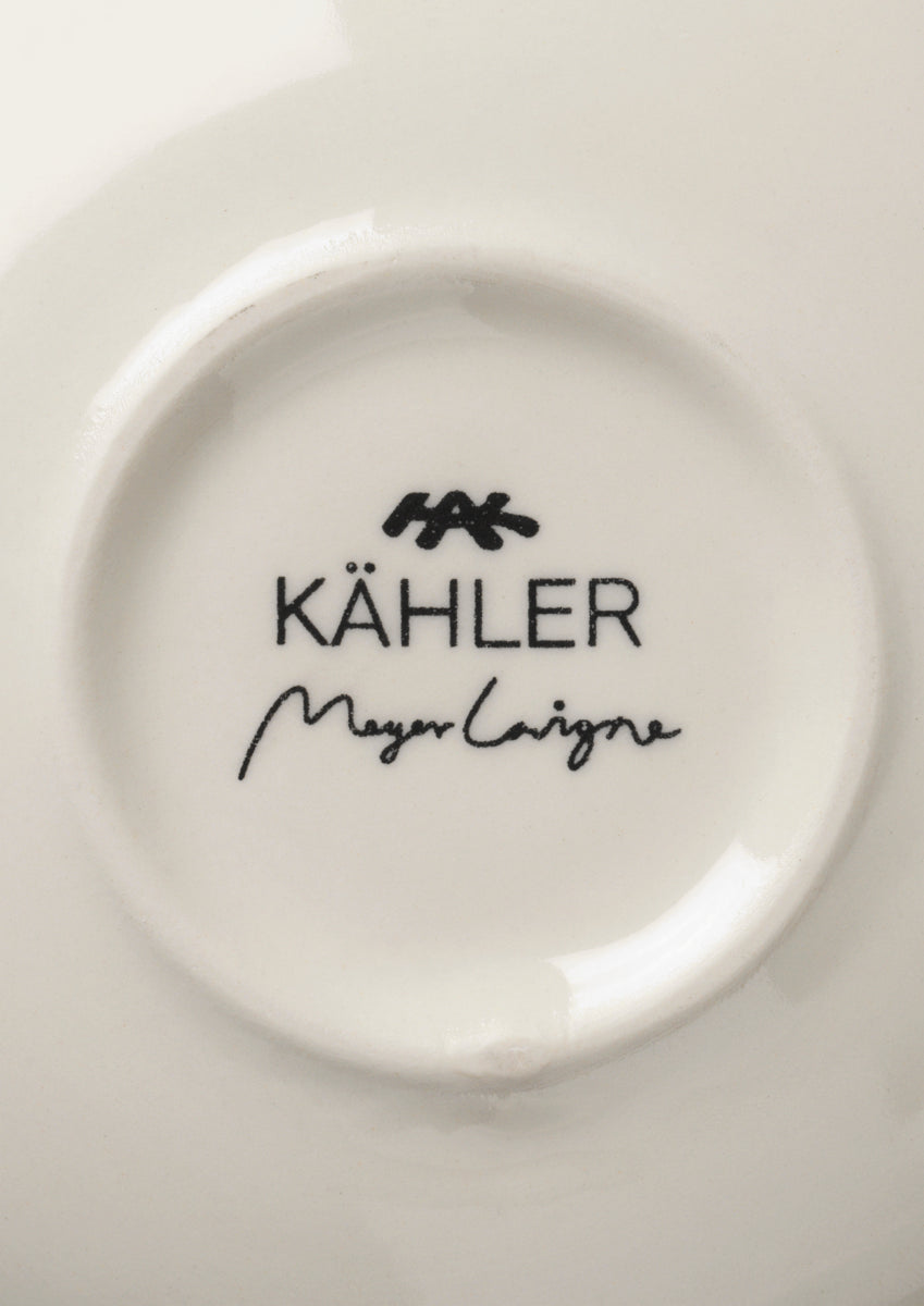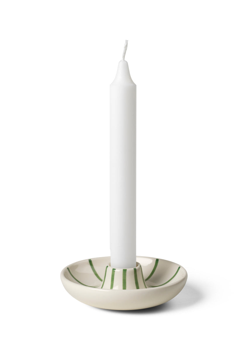 Inspired by nature, Meyer Lavigne has created two vases for Kahler with the playful and, subtle expression that is the signature of this design duo, hence the name Signature. A new candle holder has now been added to the range, created with the same poetry, design language and motifs as the vases. The stoneware candle holder has a soft, organic expression with the beautiful symmetry of flowers and leaves. The inside of the low candle holder is decorated with hand-painted, dusty-green stripes, while the candle is placed in the center to complete the design. The candle holder fits a regular chandelier candle, and by using a colored, twisted or ombre candle you can create your very own style. In the spirit of Kahler's artisanal design tradition, the green stripes are painted by hand and have the life, dynamism and authenticity in their expression that is so important to Meyer Lavigne's design language.