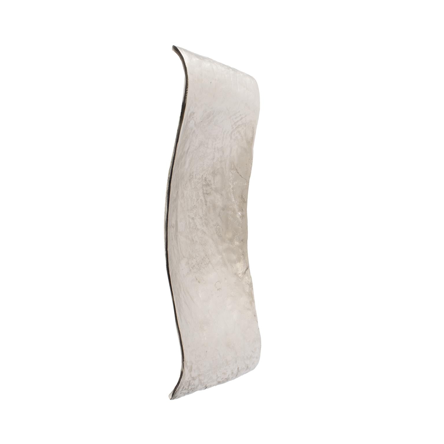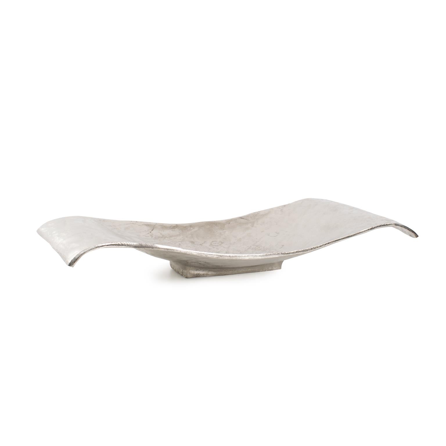 This tray is a gorgeous display piece. It is fashioned from metal into an organic scrolled rectangular shape. It has a hammered texture which brilliantly shows off its silver finish. Console tables, book shelves, desks or any other place that an accent is needed, are the perfect places for this decorative tray. But that's not all! This piece comes with hardware so that you can hang it on the wall for a sculptural wall art piece! Pair with the other colors and sizes for a striking collection on your wall or table! *For decoration ONLY. Item is NOT food safe or suitable to hold water.