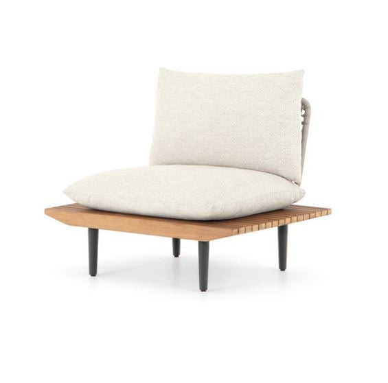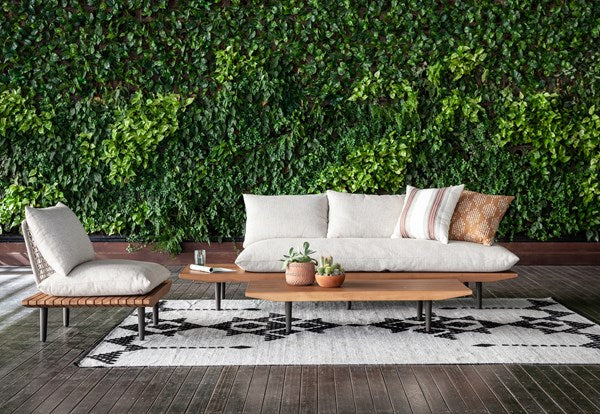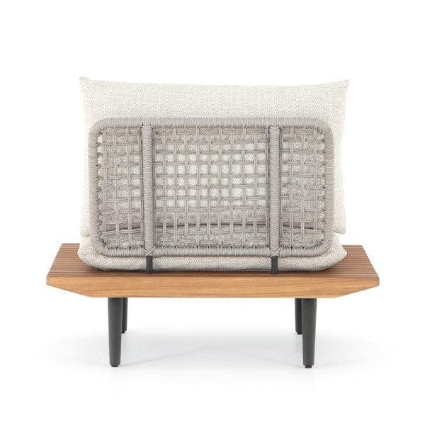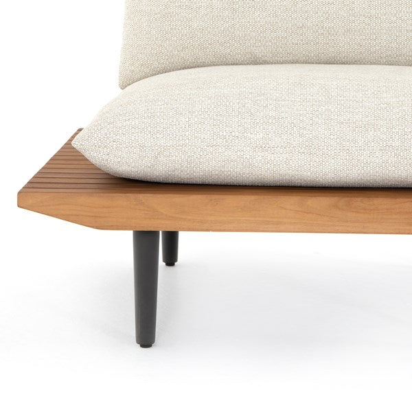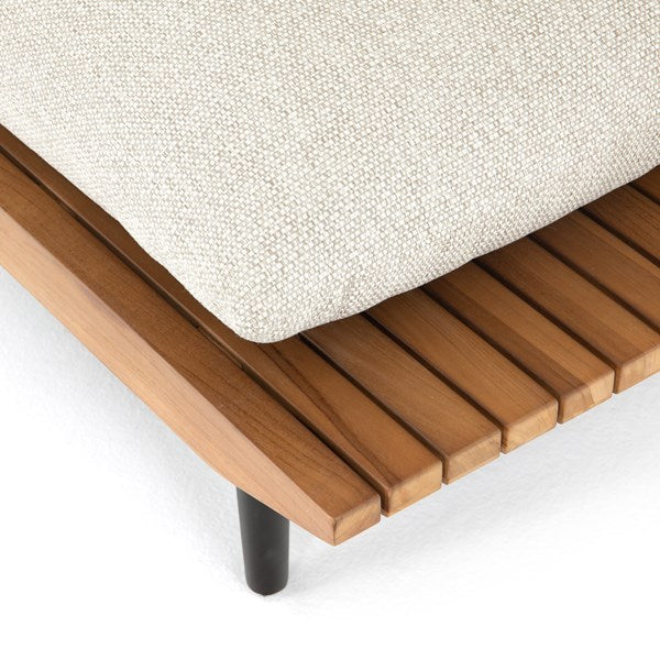 Try a cleverly functional take on outdoor styling. A slatted platform base of FSC-certified teak extends beyond durable sand-colored cushioning to create a movable makeshift end table, perfect for outdoor entertaining. Cover or store indoors during inclement weather and when not in use.