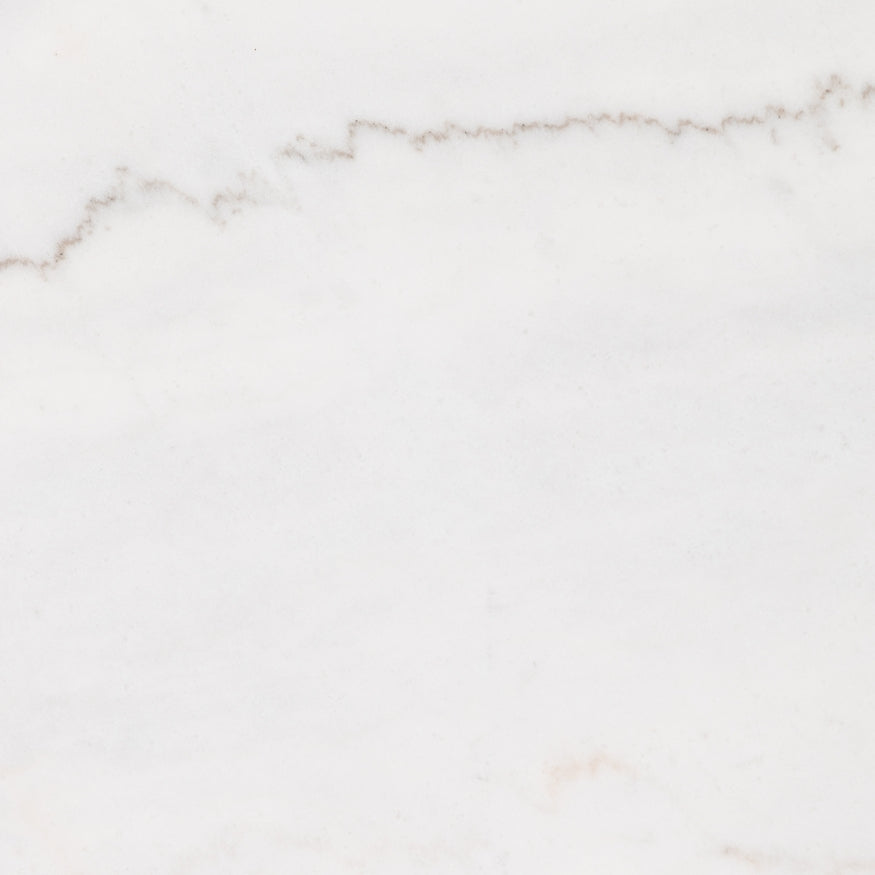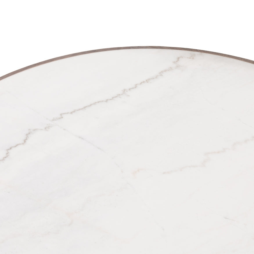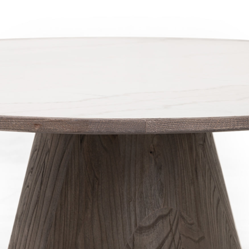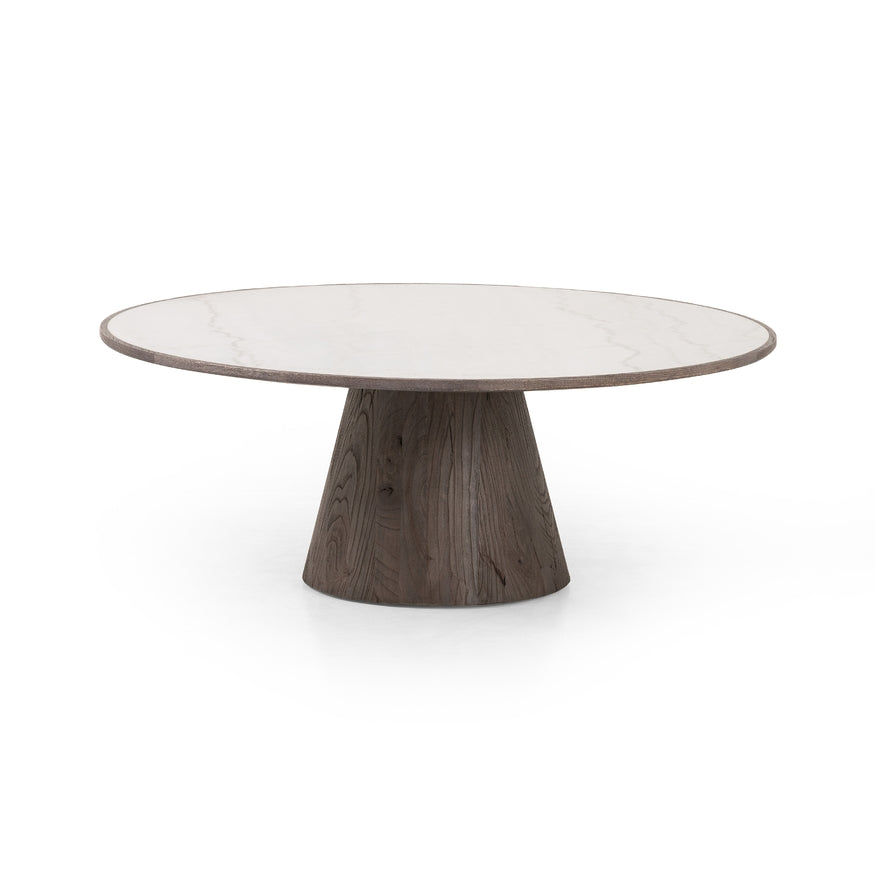 Mixed materials make for great drama. A cone-tapered base of dark weathered oak supports a rounded tabletop of white-finished solid marble, with oak banding on the edges for contrast.