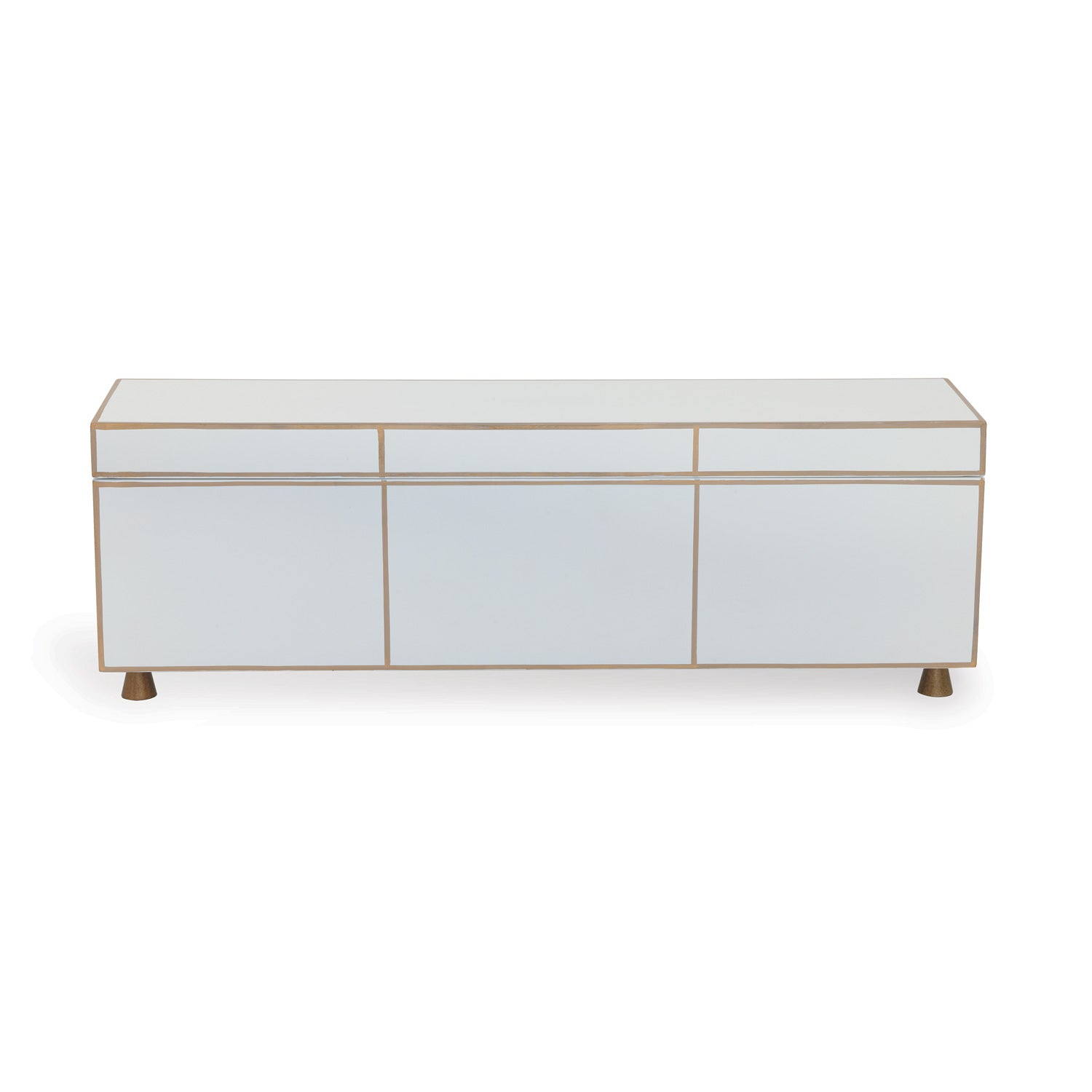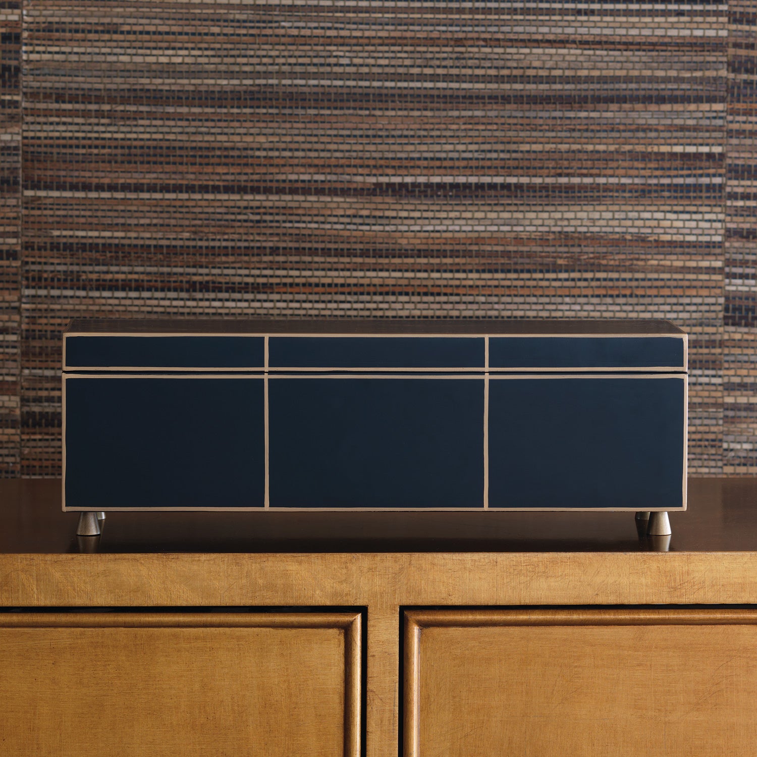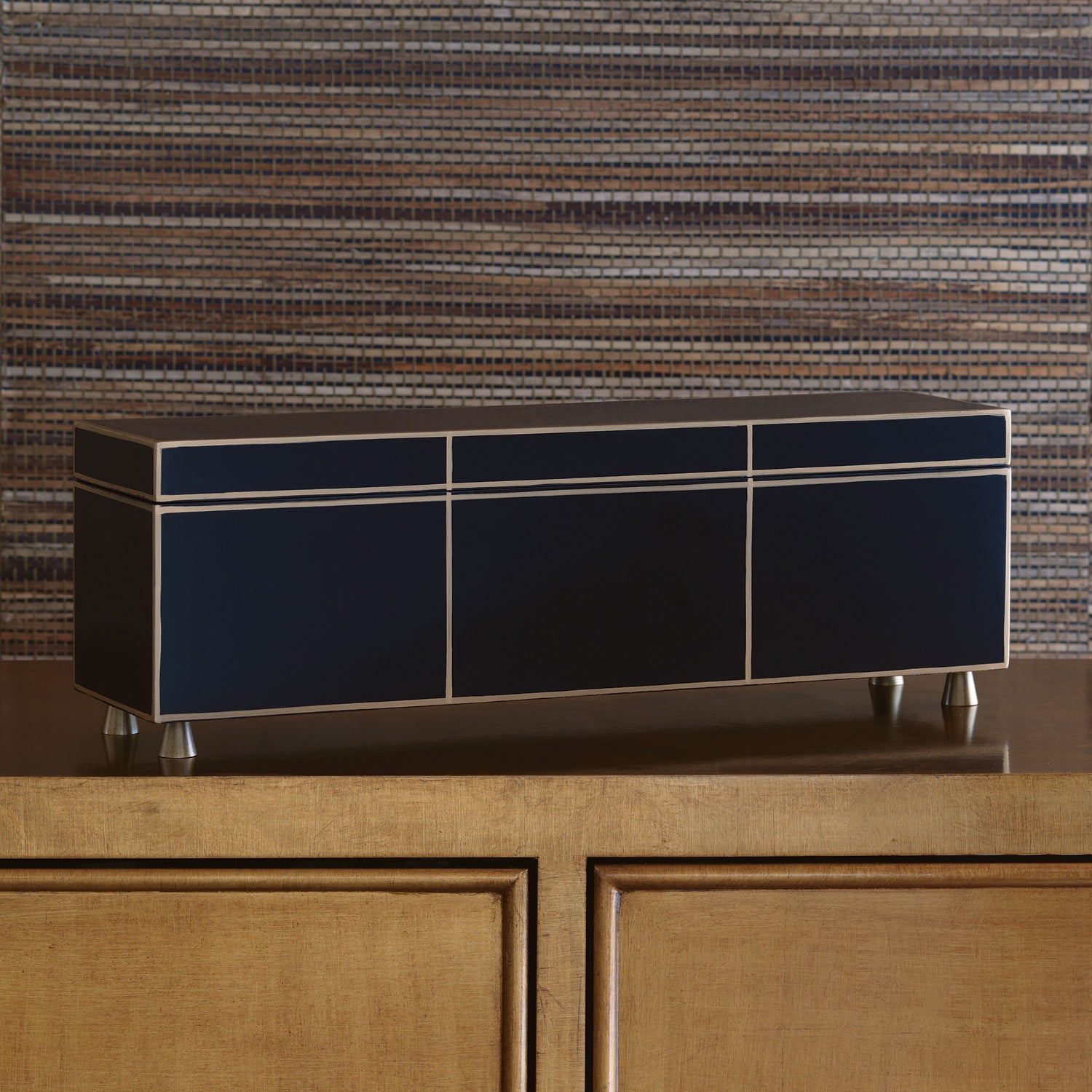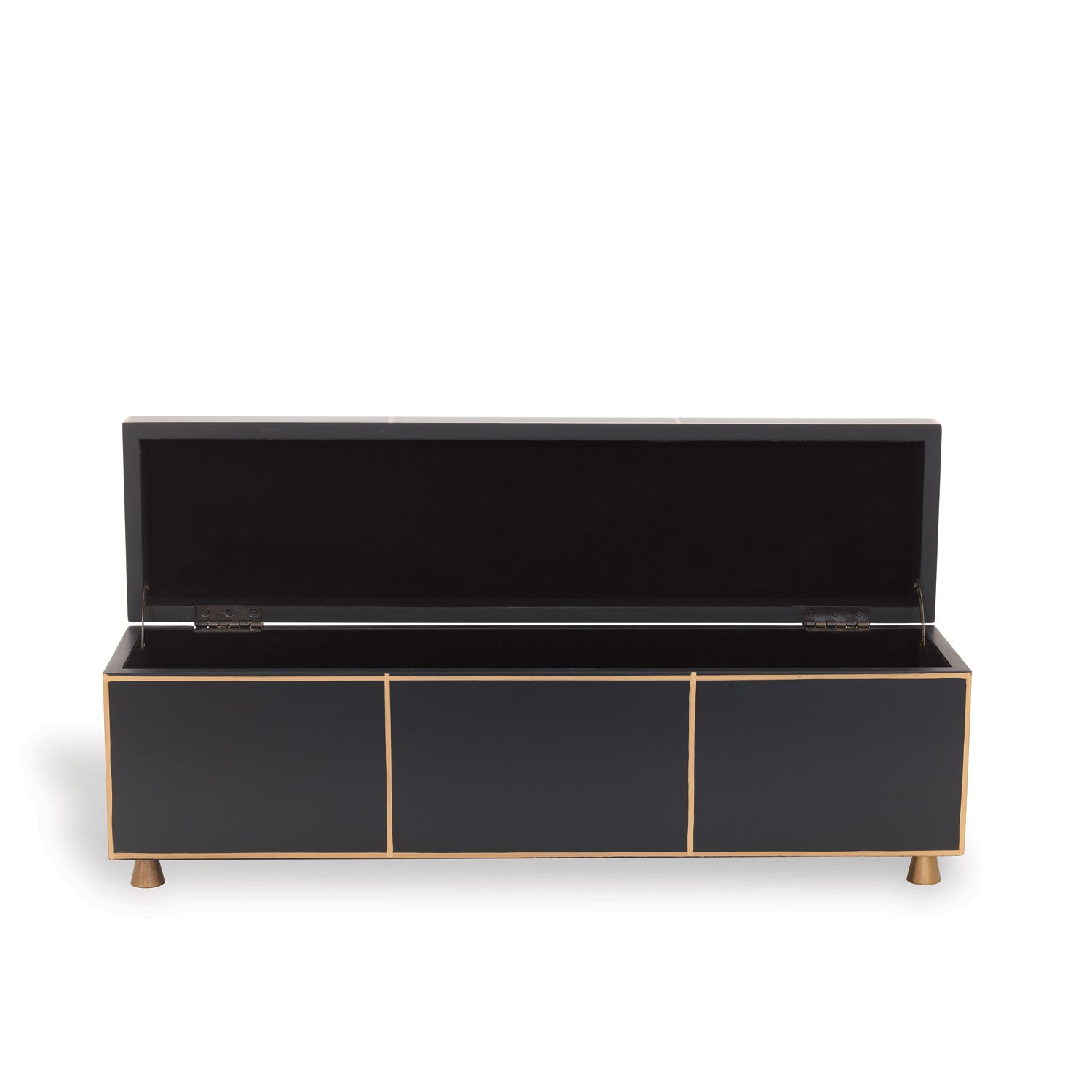 Modern mantle box with mid century style cone brass feet. Velvet lined interior. Lift up top with hinge. Scaled for your mantle, sideboard or coffee table. Wonderful hidden storage for media remotes, wallets and keys. Mantle box is available in gloss black and gloss white, accented with a gold rule lines. Materials: MDF wood, brass