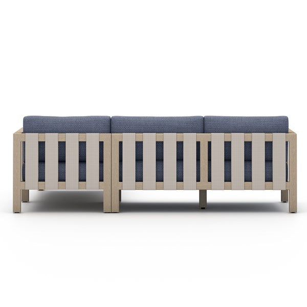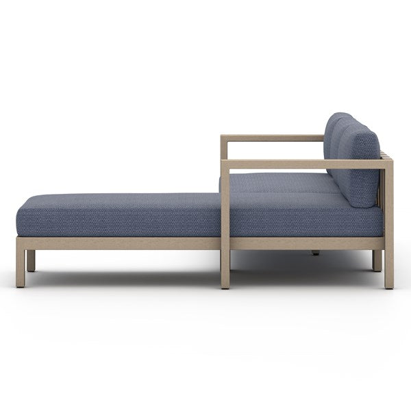 Lounge in style. FSC-certified teak forms an angular, minimalist frame for weather-resistant seating, with rear strap detailing for textural intrigue. Left arm-facing chaise sectional. Cover or store indoors during inclement weather and when not in use.