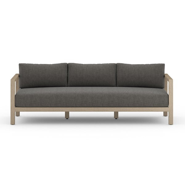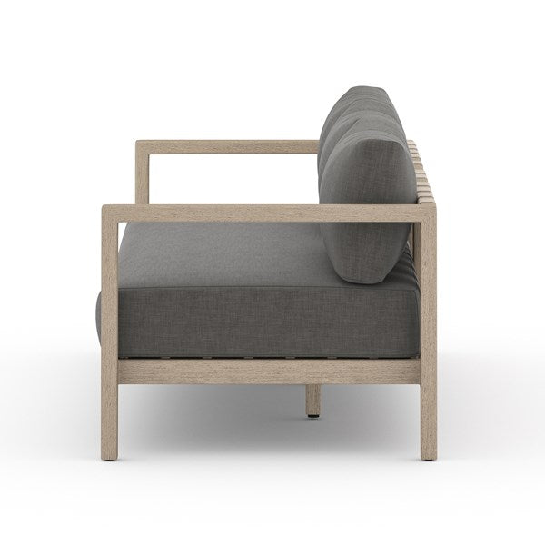 Modern materials ready a stylish silhouette for the outdoors. Weathered grey teak forms a three-seat frame for UV-resistant and water-repellent Sunproof fabric in charcoal. Back straps add intrigue. Cover or store indoors during inclement weather and when not in use.