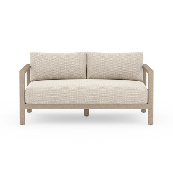 Modern materials ready a stylish silhouette for the outdoors. Weathered grey teak forms a clean two-seat frame for UV-resistant and water-repellent Sunproof fabric in a faye sand. Back straps add intrigue. Cover or store indoors during inclement weather