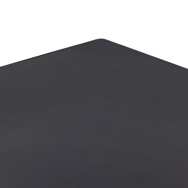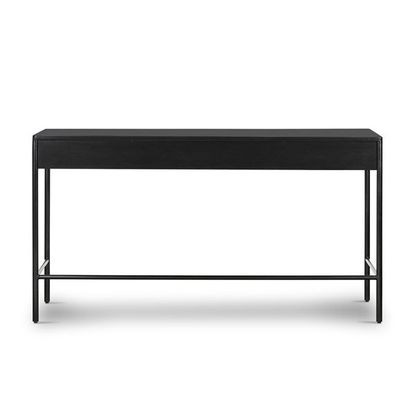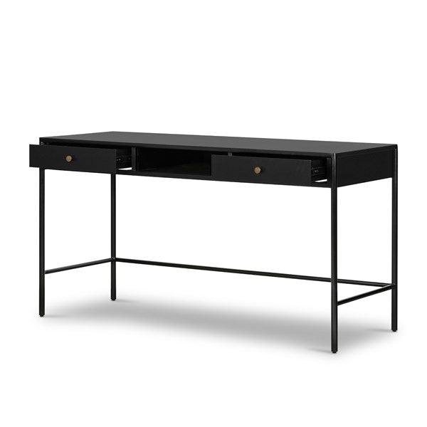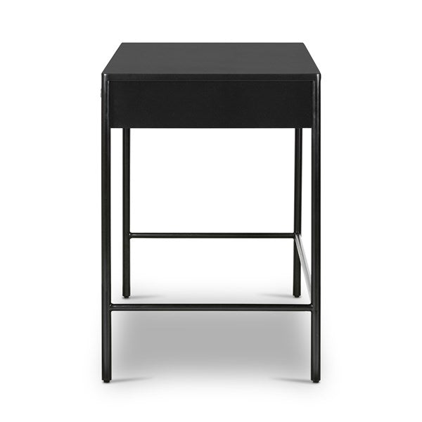 Slim and streamlined, with a touch of industrial edge. Made from black-finished iron with bronze-finished hardware and dual drawers for convenient storage.