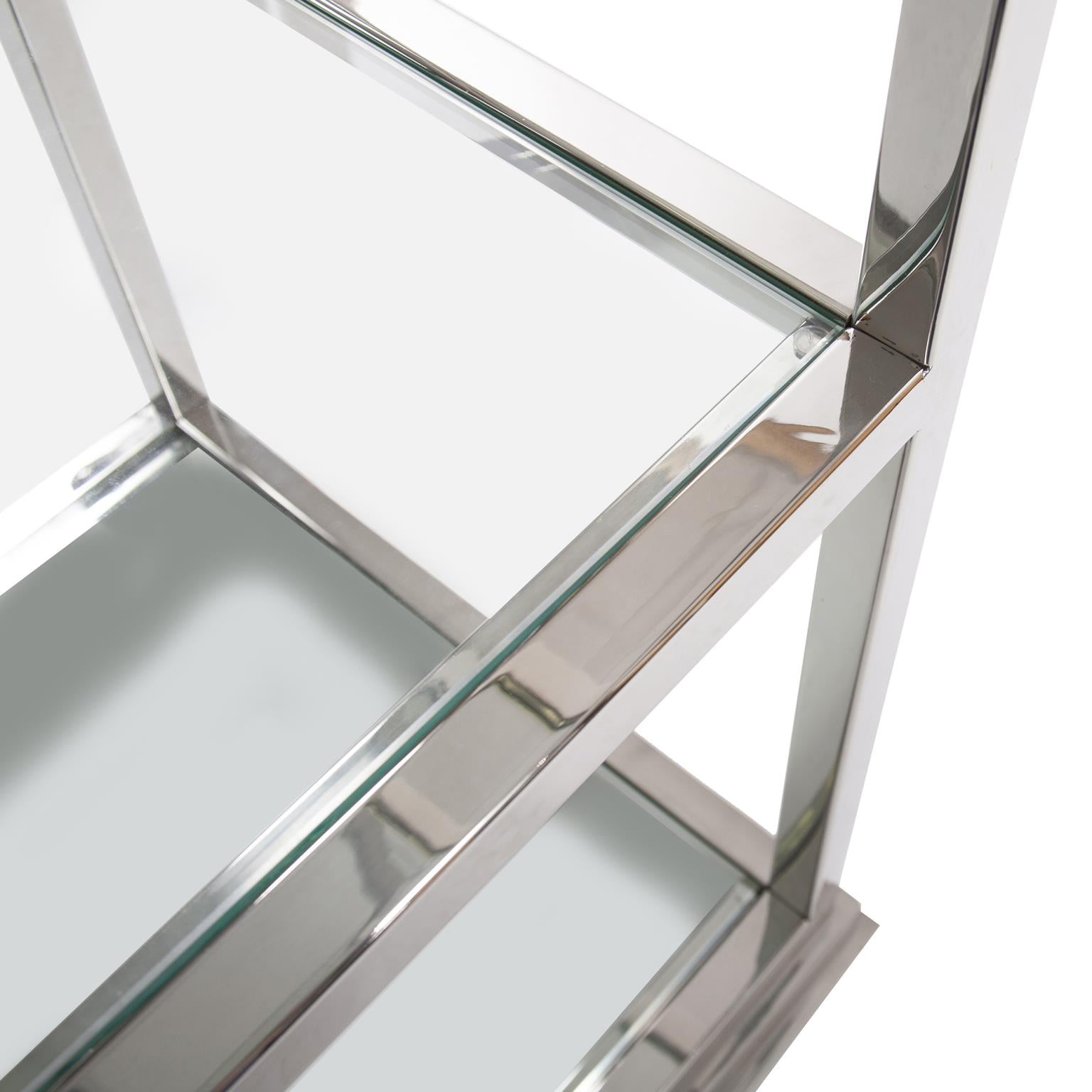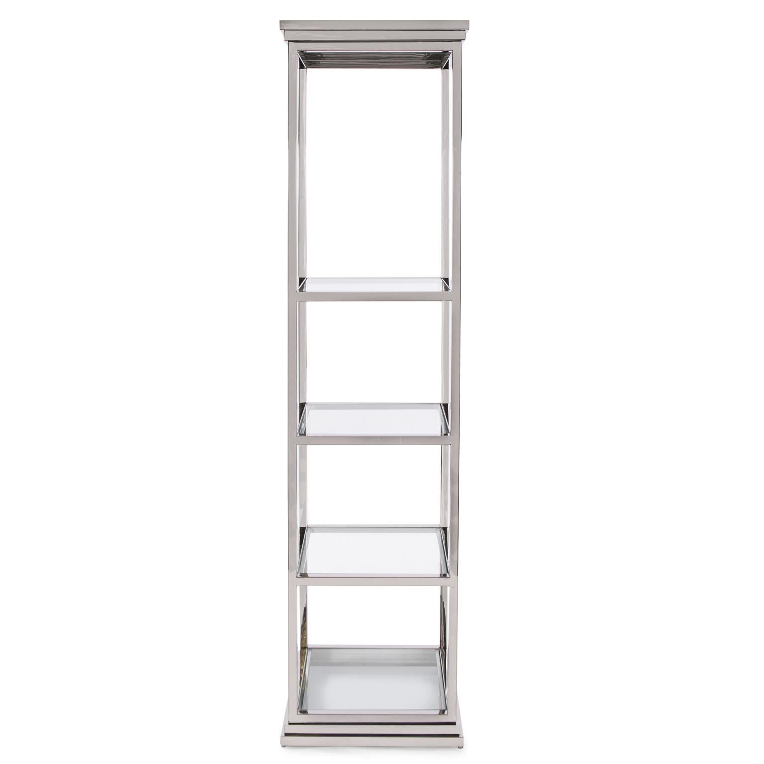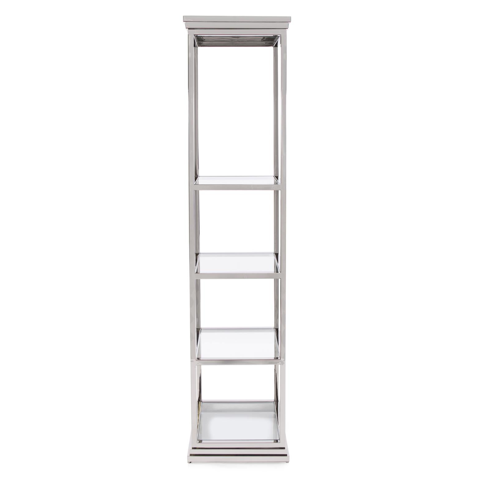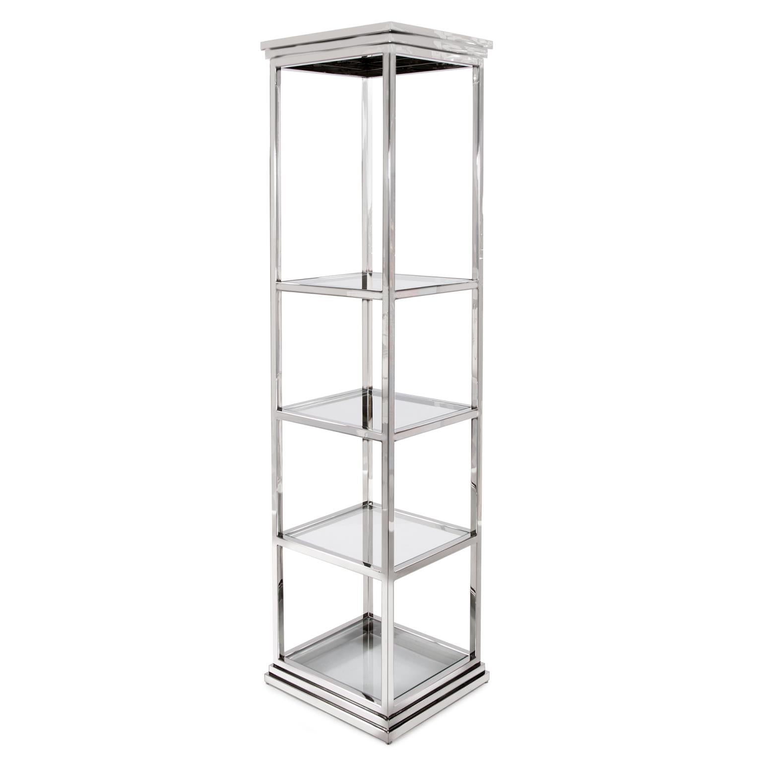 This etagere shelf is an excellent example of a classic design updated by a modern finish. The straight lines of the frame lends itself to any design style. The stainless steel frame is finished in a polished silver and features tempered glass surfaces.