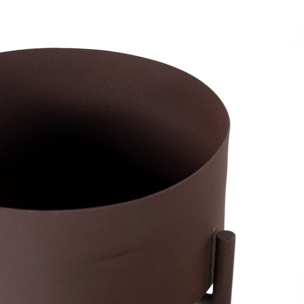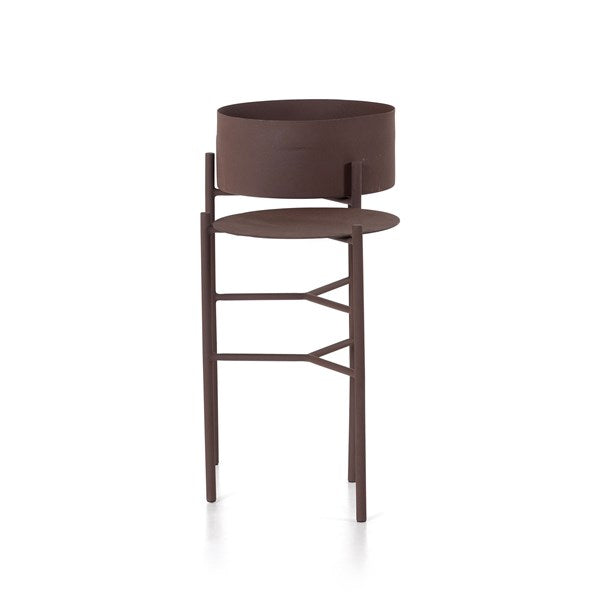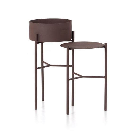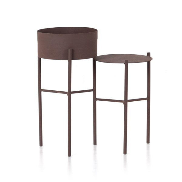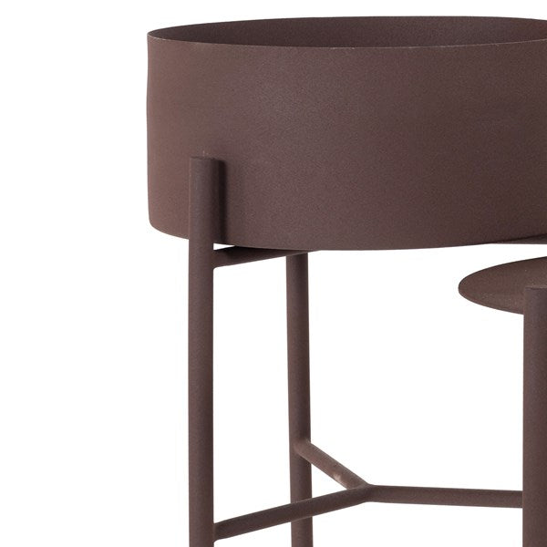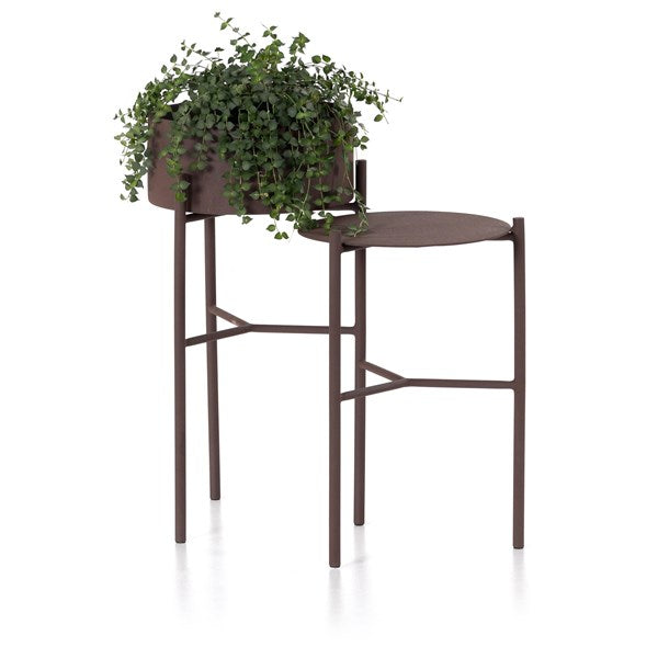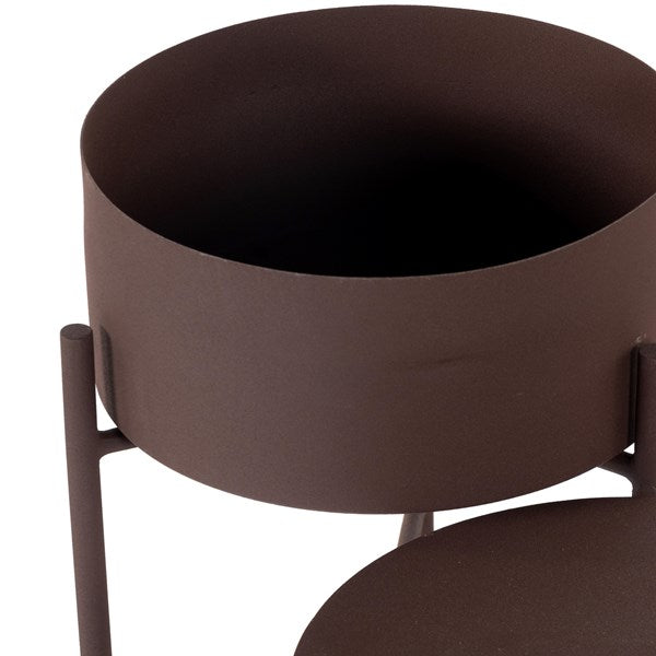 Finished in a unique red clay, a tiered iron plant stand features an accompanying surface for extra space and styling options. Cover or store indoors during inclement weather and when not in use.