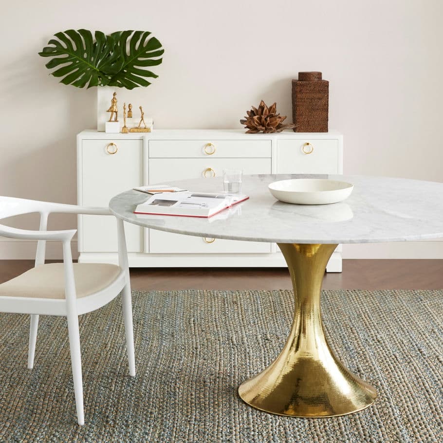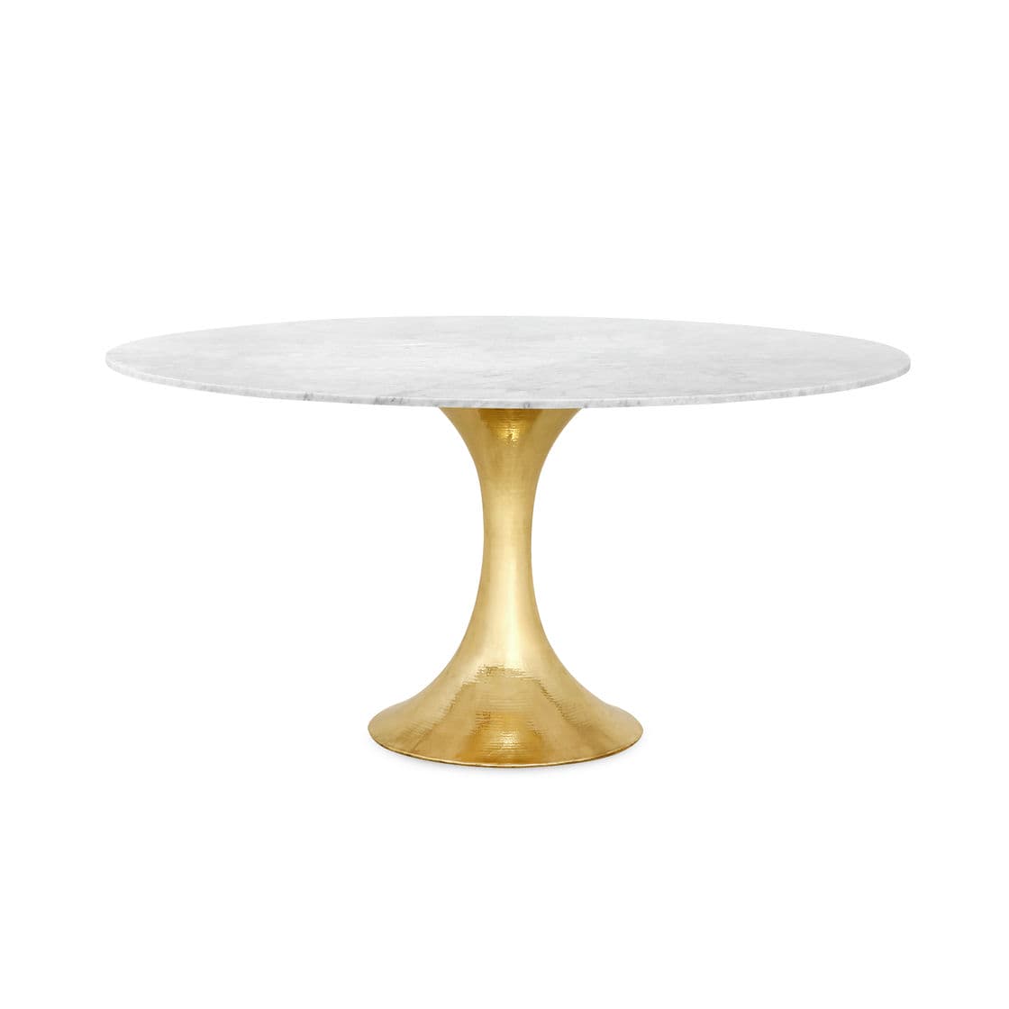 From its strikingly modern silhouette rooted in retro-futurism, to its range of shining finishes and luxurious materials, the Stockholm Dining Table collection is one of Villa & House's most beloved crown jewels. Since we are committed to crafting pieces that perfectly fit your space and personal style, the Stockholm's range of wood and marble tabletops and hand-hammered bases allow for fun mix-and-match customization, ensuring a fashionable and functional reflection of your own unique taste. Each rounded tabletop and flared-out base is inspired by Eero Saarinen's iconic Tulip design, dating back to the late 1950s. Slight variations in size, height, and finish provide a wide array of design impressions. Opt for Art Deco glamour or space-age chic, quiet sophistication or swanky the possibilities are truly endless. Whether used as an intimate dining table or dramatic accent table, the Stockholm is an impressive furnishing with an instantly recognizable profile.