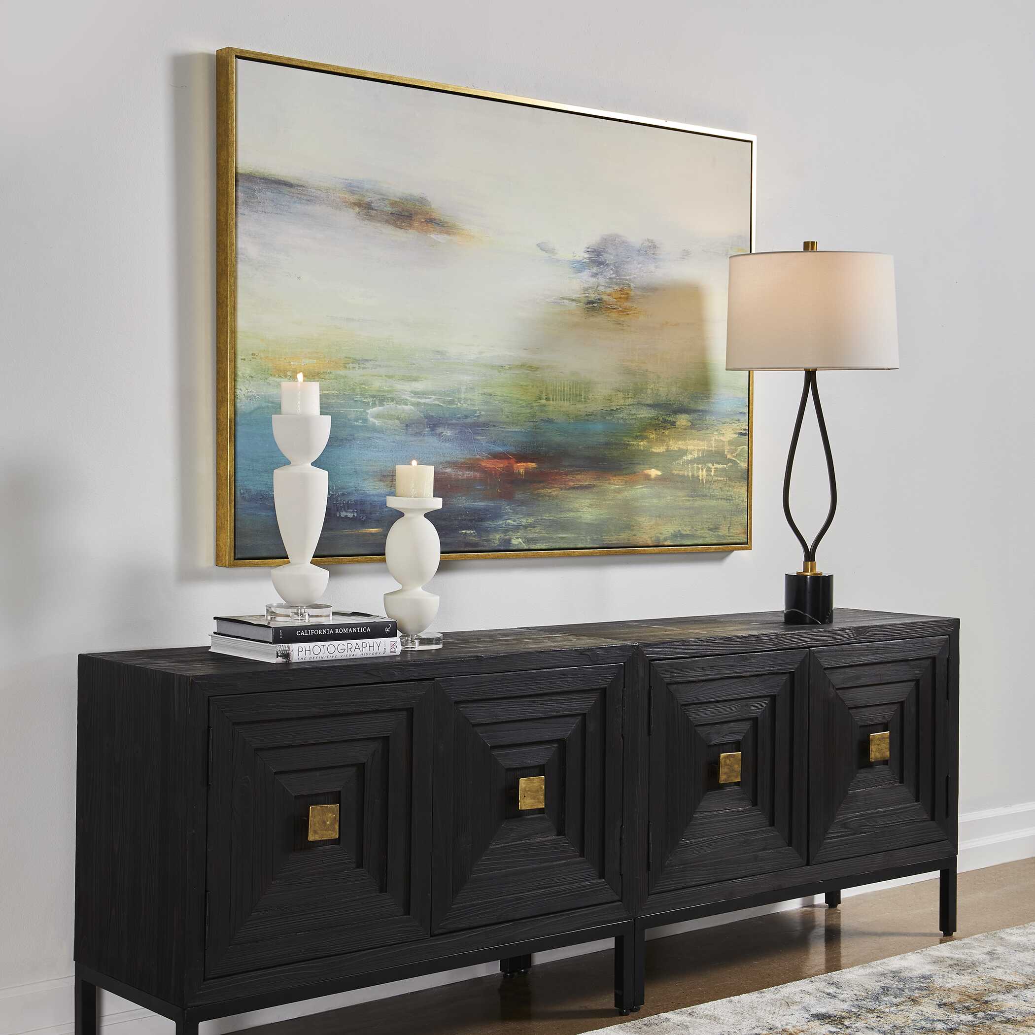 Shades Of Olive, Teal, Burnt Orange And Gray Make Up This Abstract Giclee On Canvas. Complimented By A Solid Wood Gallery Frame With Gold Finish, This Piece May Be Hung Horizontal Or Vertical. Each Canvas Is Proudly Handcrafted And Printed In The USA. Artwork By Lisa Ridgers.