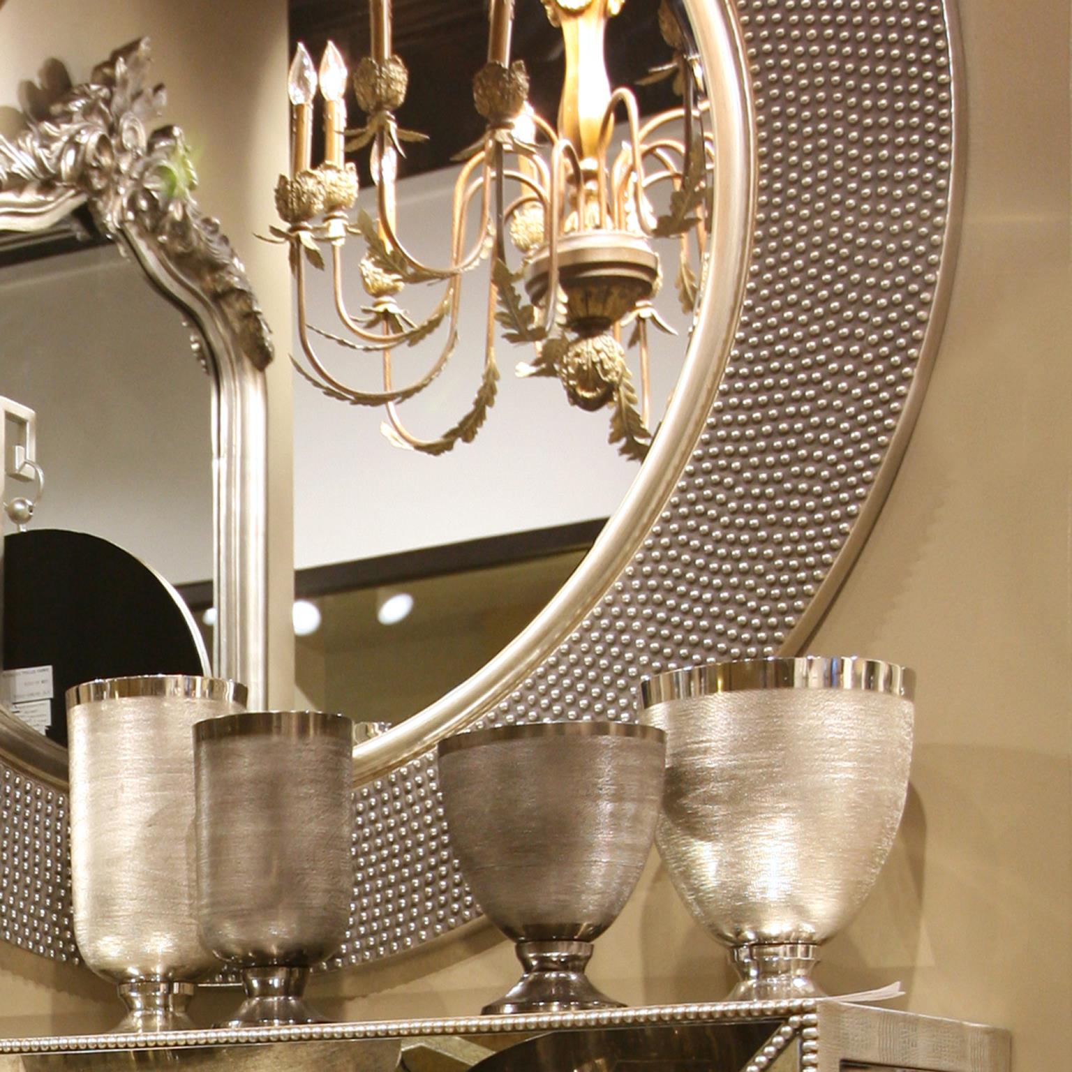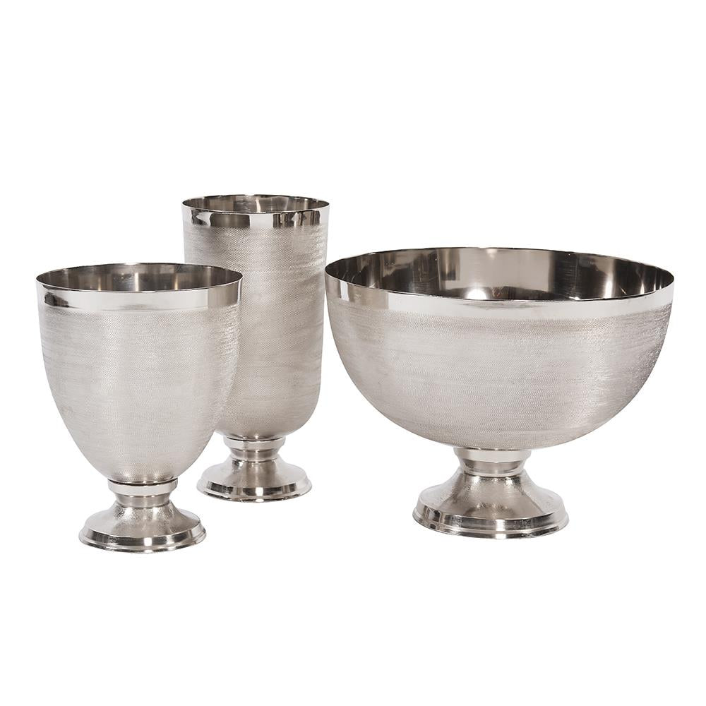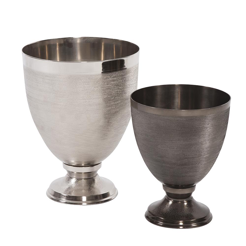 This vase features a regal goblet shape fashioned from aluminum metal. The body of the vase is textured with a fine, chiseled cross hatch design. It is then finished in a bright silver. Additional sizes and colors are available. Pair with the other pieces in the collection for a complete look. The base of this piece removes for safe shipping.