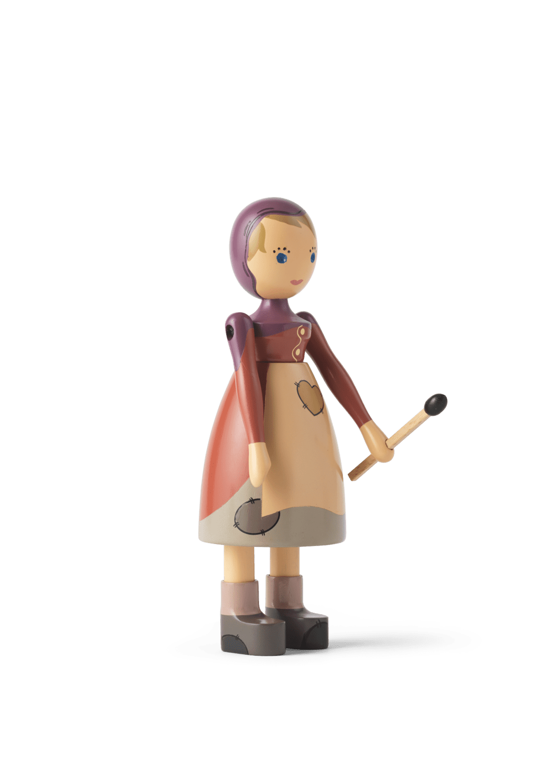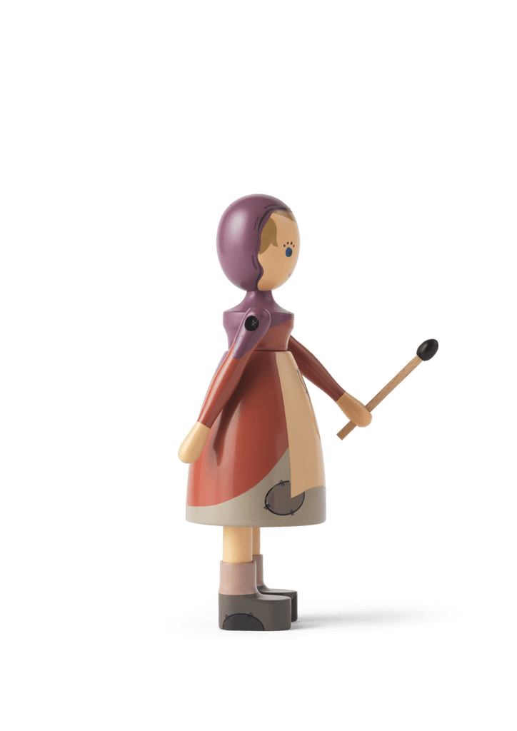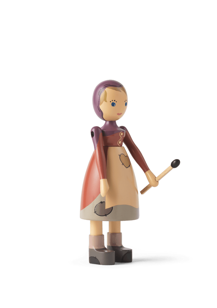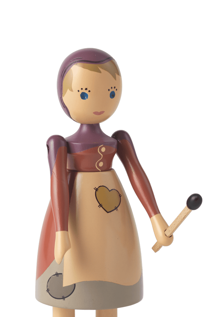 Let the adventure live on through original wooden stories. In 2021, when the H.C. Andersens Hus museum opened in Odense, the museum and Kay Bojesen Denmark began a collaboration, to make it now possible to find some of the most famous and loved figures from the world-famous fairy tales interpreted in Kay Bojesen's universe of original stories in wood. The Nightengale, The Shepherdess and the Chimney Sweep and The Sandman were the first to move onto the shelves of the museum store. The Little Match Girl has also found her way into the warmth. In Kay Bojesen's interpretation, she wears a hood that goes down over her shoulders. The little girl has patches on her dress and apron, which are kept in toned-down colors, emphasizing that she comes from poverty. Her warm smile and gentle, innocent expressions are born of the beautiful experiences she envisions while gazing in the firelight, when on a cold New Year's Eve her imagination awakens with fantastic dreamscapes filled with joy and security. In her hand, she holds a matchstick that completes the story. The Little Match Girl measures 5.7" in height and is turned in FSC-certified beech wood, and the manual production with paint and printing is carried out with the great precision and care that characterize Kay Bojesen's wooden figures. The shape is based on the original Lise figure from Kay Bojesen's archive, which is simple and minimalistic, but full of life and soul. This gives the Little Match Girl a feeling of magic and adventure that is in line with Kay Bojesen's spirit and the storytelling he managed to create in designing his imaginative figures.