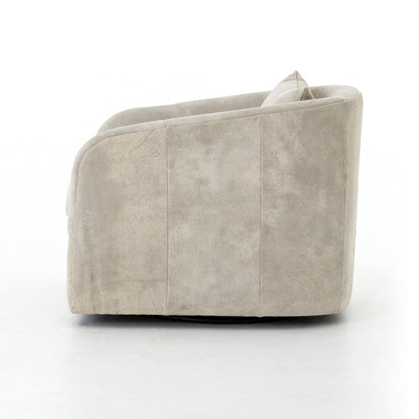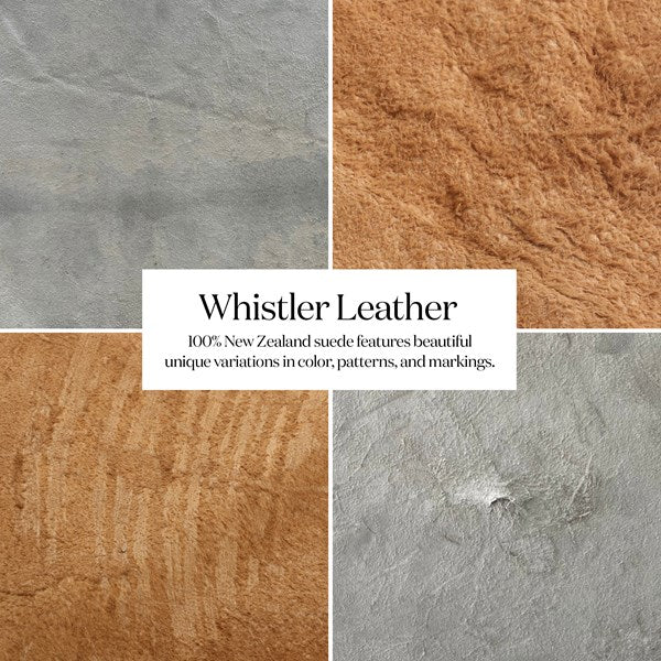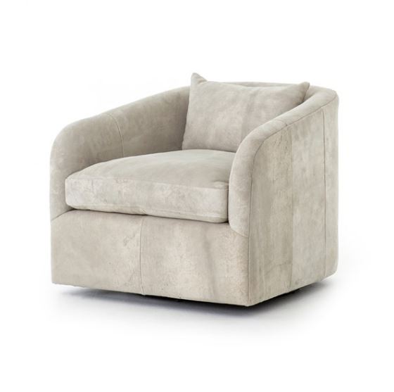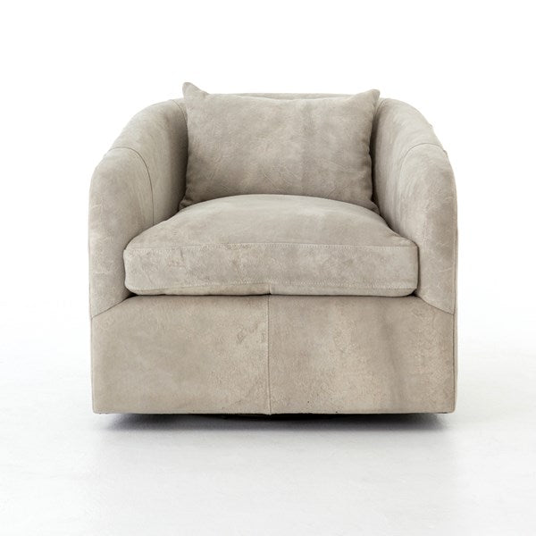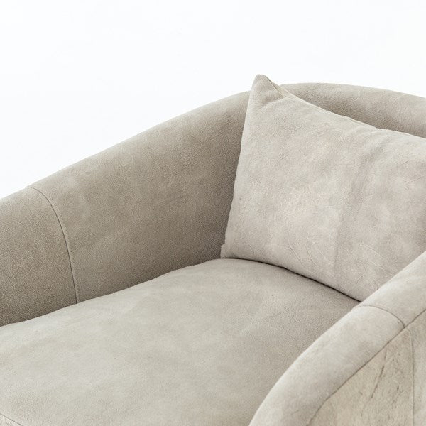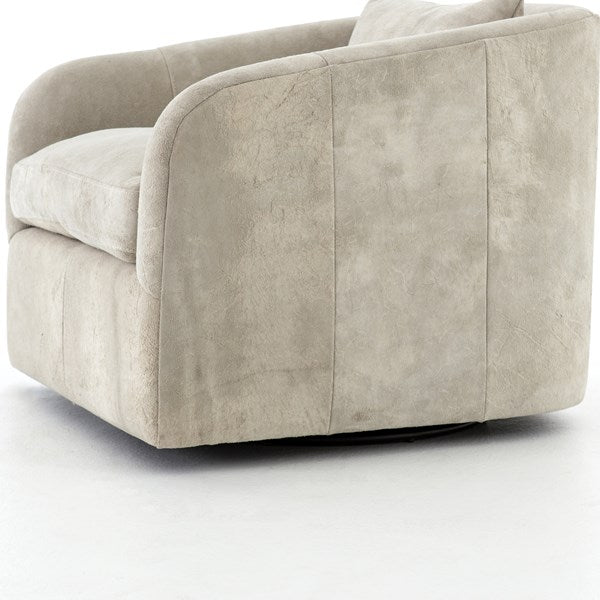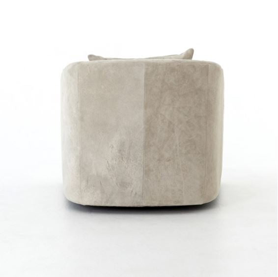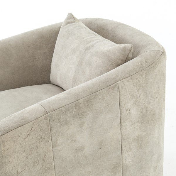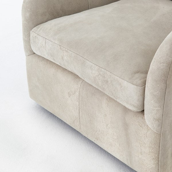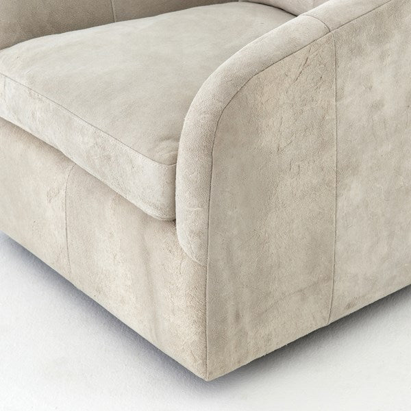 Understated luxury, soft to the touch. 100% New Zealand-crafted suede is artfully sanded to accentuate the variations in color, patterns, and markings of the individual hide's authentic natural beauty. Curved arms, plush seating, and a single pillow create a laid-back look, while a hidden swivel turns a traditional form into something novel.