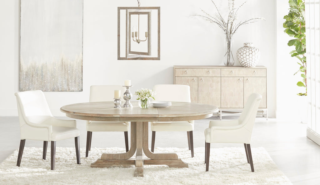 Transitional style dining table featuring 17.5" extension leaf and single pedestal base.