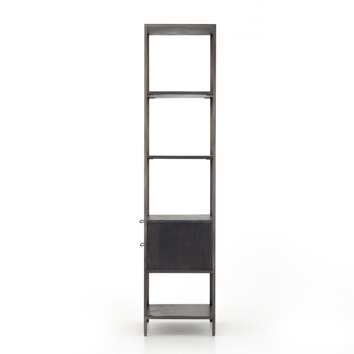 A stylish bookshelf of black-washed poplar offers ample storage space by way of open shelving and dual drawers. Metal-secured pulls of toffee top-grain leather add a textural element of surprise. Great solo, doubled, or paired with matching desk or filing