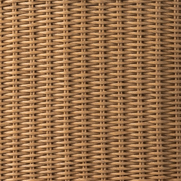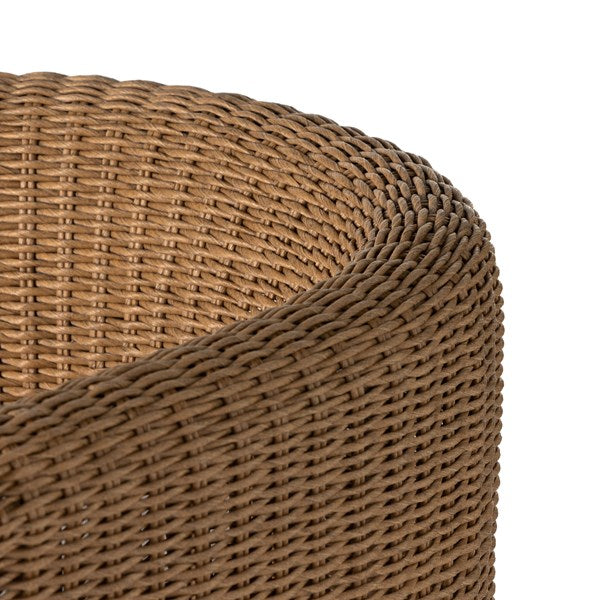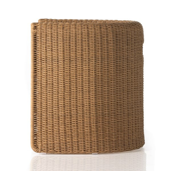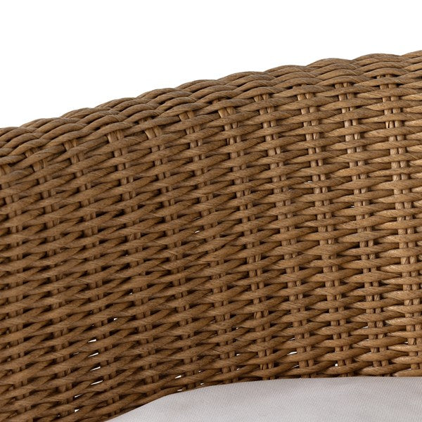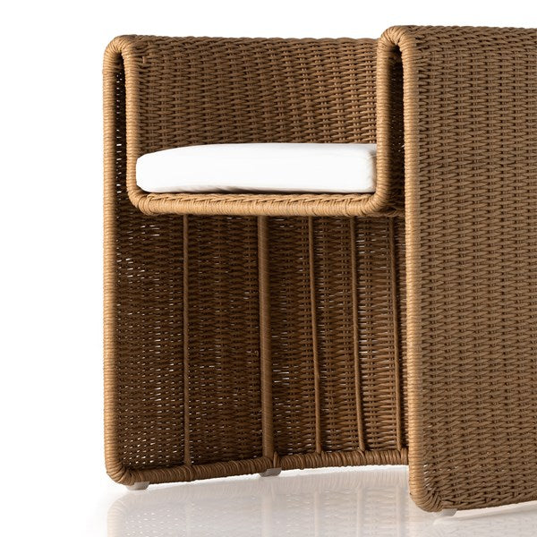 A nod to curvy Seventies styling, woven wicker framing forms a fluid, sling-like shape and waterfall arm, with durable tufted cushioning in a versatile white. Cover or store indoors during inclement weather and when not in use.