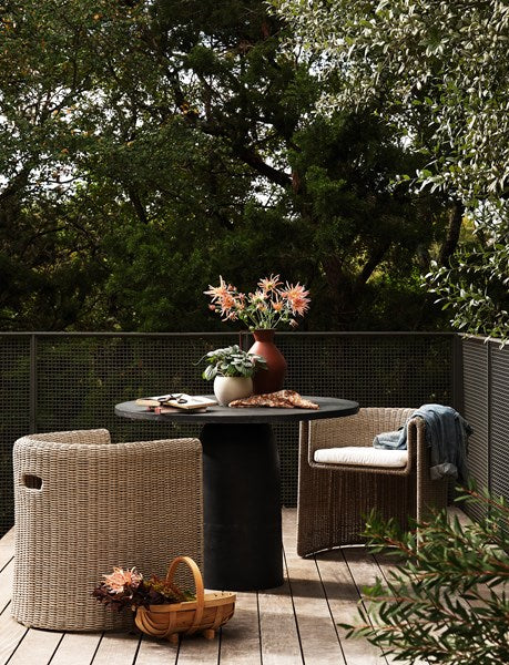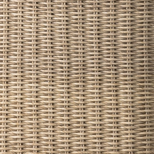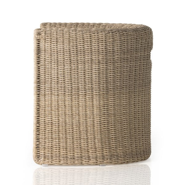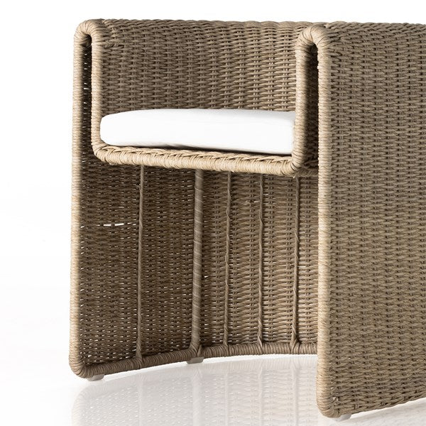 A nod to curvy Seventies styling, woven wicker framing forms a fluid, sling-like shape and waterfall arm, with durable tufted cushioning in a versatile white. Cover or store indoors during inclement weather and when not in use.