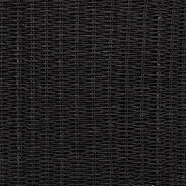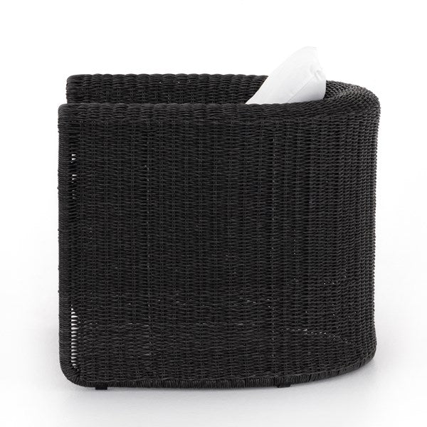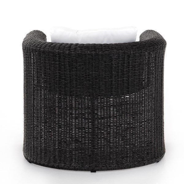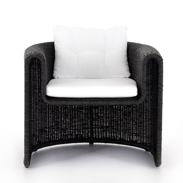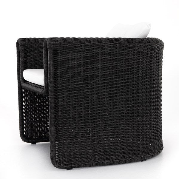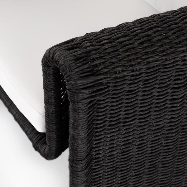A nod to curvy Seventies styling, coal-colored wicker framing forms a fluid, sling-like shape with a waterfall arm, with durable tufted cushioning in a versatile white. Cover or store indoors during inclement weather and when not in use.