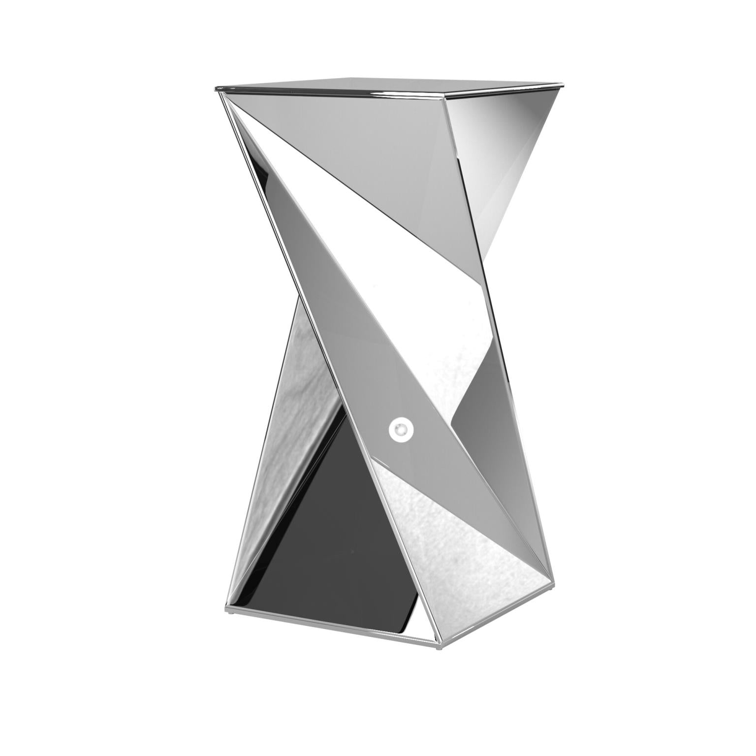 The Aries Side Table is a stunning pedestal design with a mirrored body. Its rectangular form is twisted creating angular planes that make for the most amazing displays of light and reflections. Each mirrored panel has a small bevel that adds to the table's style and beauty. Every surface is mirrored. This mirrored pedestal will look great in an entryway, hallway, living room or any place you need a pedestal!