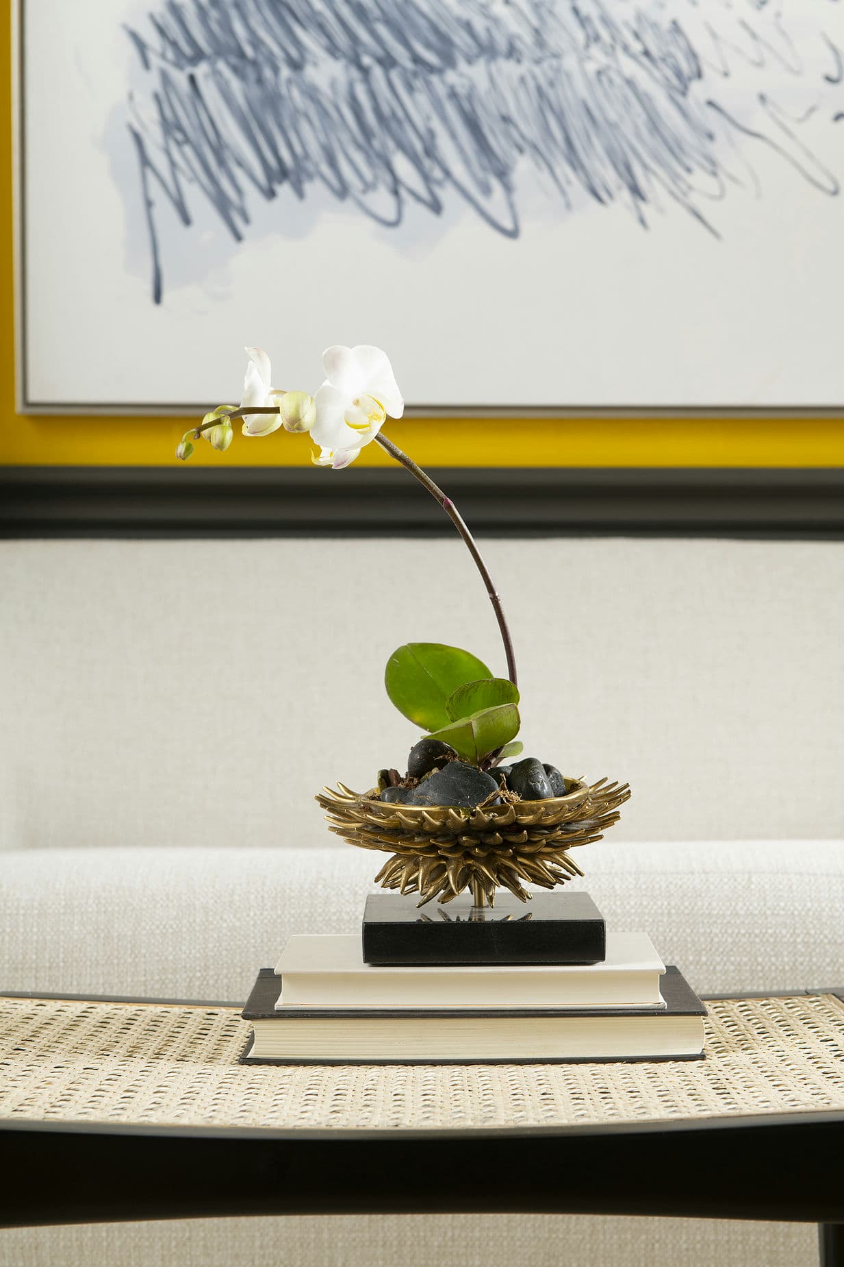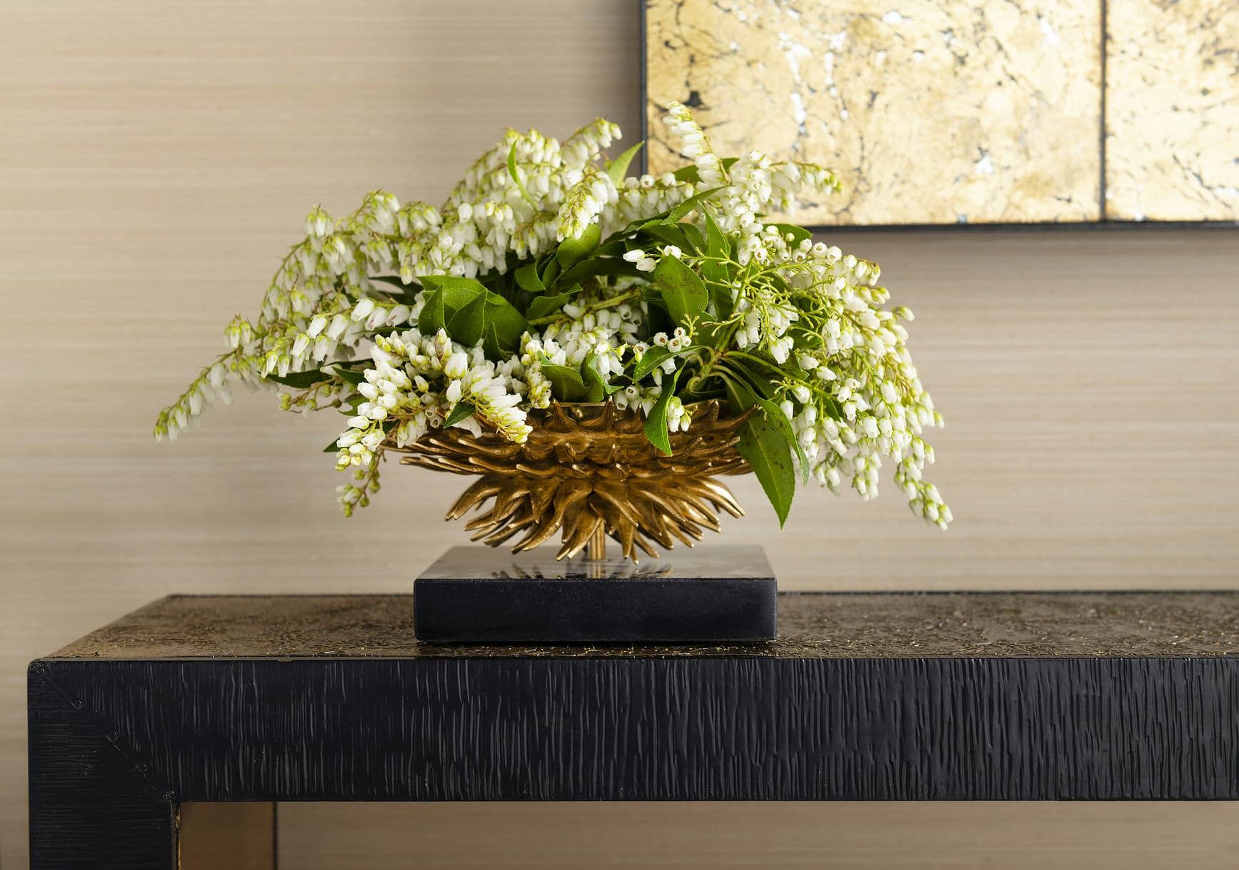 Set atop a monumental base of black marble, the Urchin Bowl is an under-the-sea treasure thata's equal parts decorative art piece and functional vessel. Inspired by the magical mystery of marine life, our artisans have designed a fantastical showpiece modeled after the organic forms of a sea urchin. A series of layered gilded spines have been hand-crafted in solid brass with a glittering hand-polished finish, resulting in a dynamic display of texture, shape, and movement. A scalloped top underscores the bowla's focus on natural shapes, while a smooth inner surface provides the perfect space for setting down keys, jewelry, or even a small bouquet of flowers. Place it in the center of a beachy-glam dining room table, or allow it to add some whimsy to a side table or console.