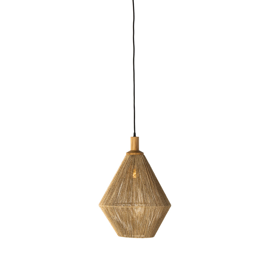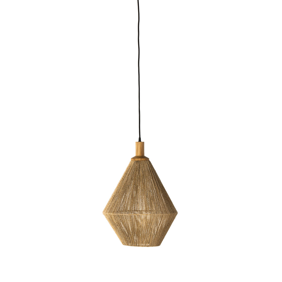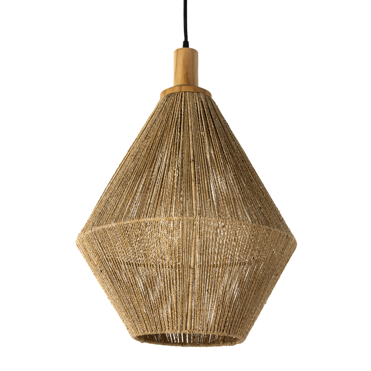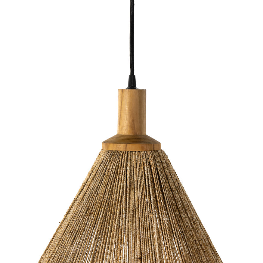 Turn on the texture. A spare, shapely pendant of natural water hyacinth pairs with a black fabric cord and teak accent.