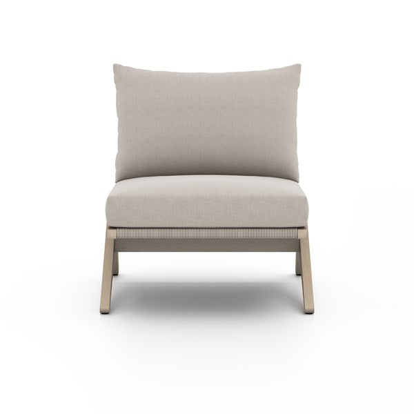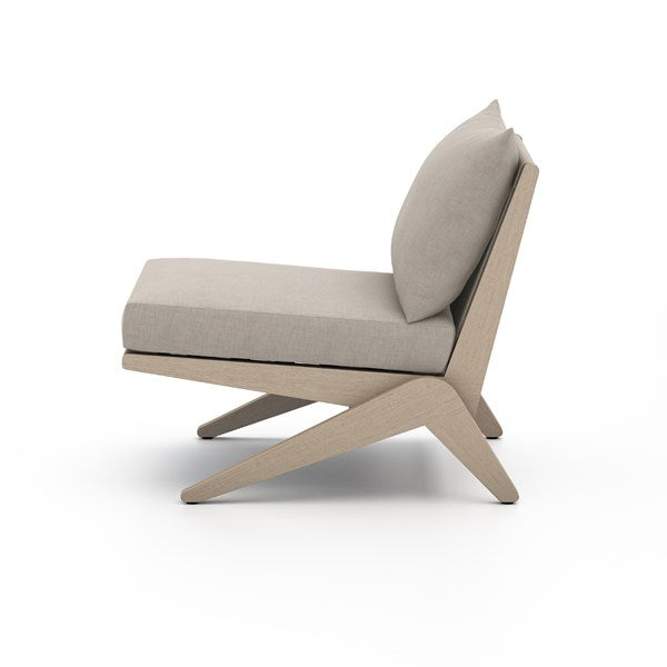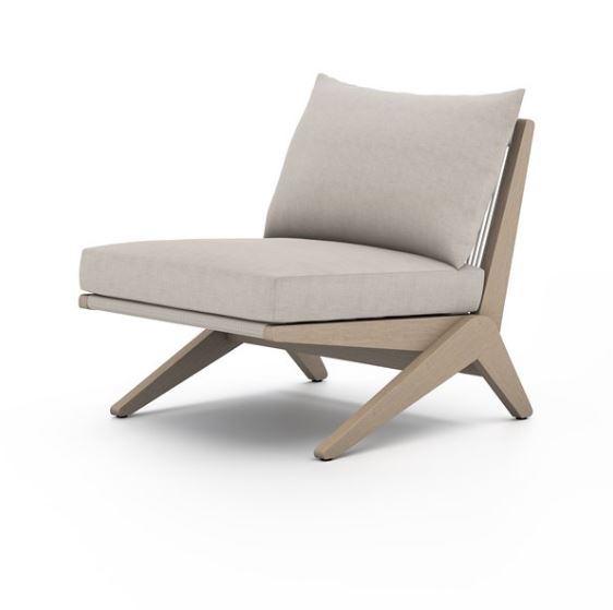 Inspired by Swiss architect Pierre Jeanneret, brown-finished FSC-certified teak forms an angled-leg frame for outdoor-friendly seating in a versatile stone grey. Rear woven rope adds a touch of texture, while a knife-edge pillow makes for a tailored takeaway. Cover or store indoors during inclement weather and when not in use.