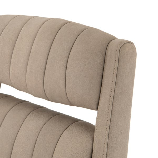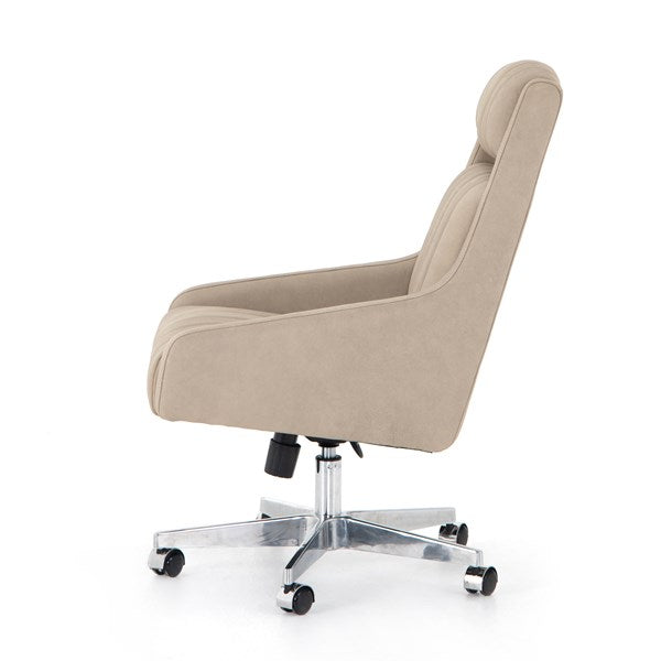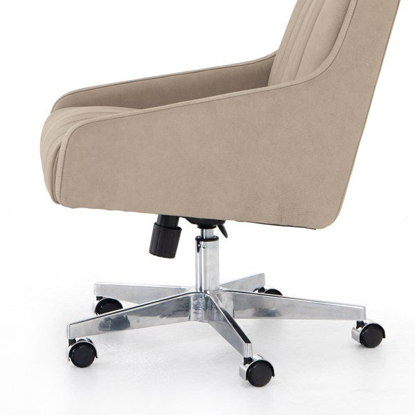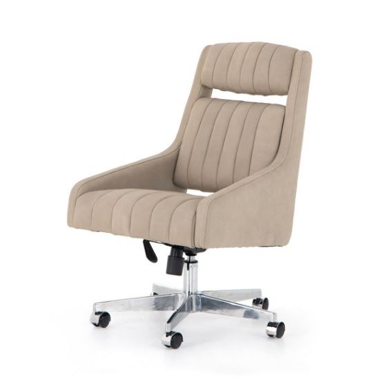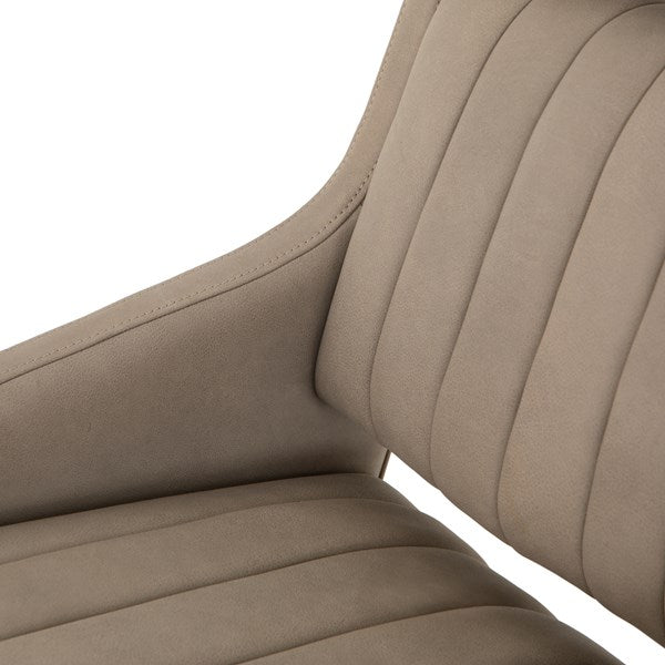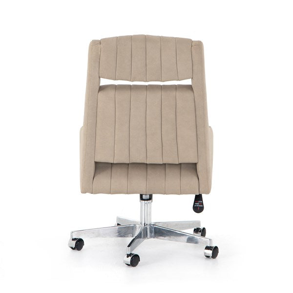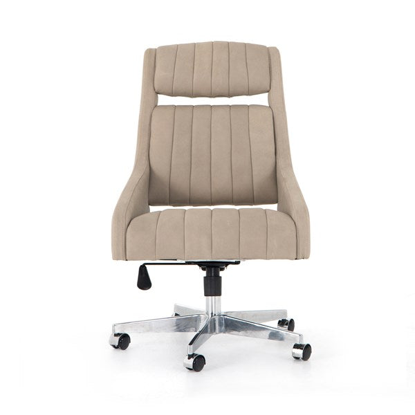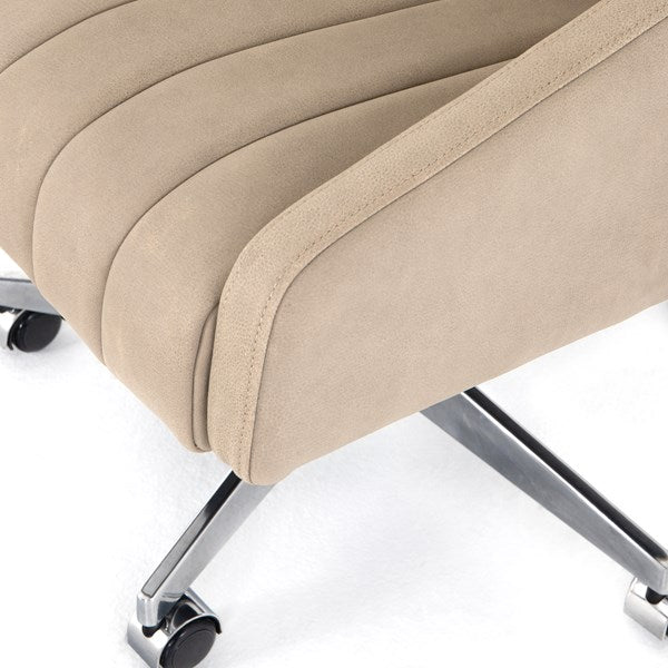 With vertical channeling for texture, softly sanded top-grain leather seating features tapered arms and cutout detailing for a modern vibe that works into varied office styles. Perfectly sized for an executive desk, with option to adjust seat height, plus tilt functionality and casters for added ease.