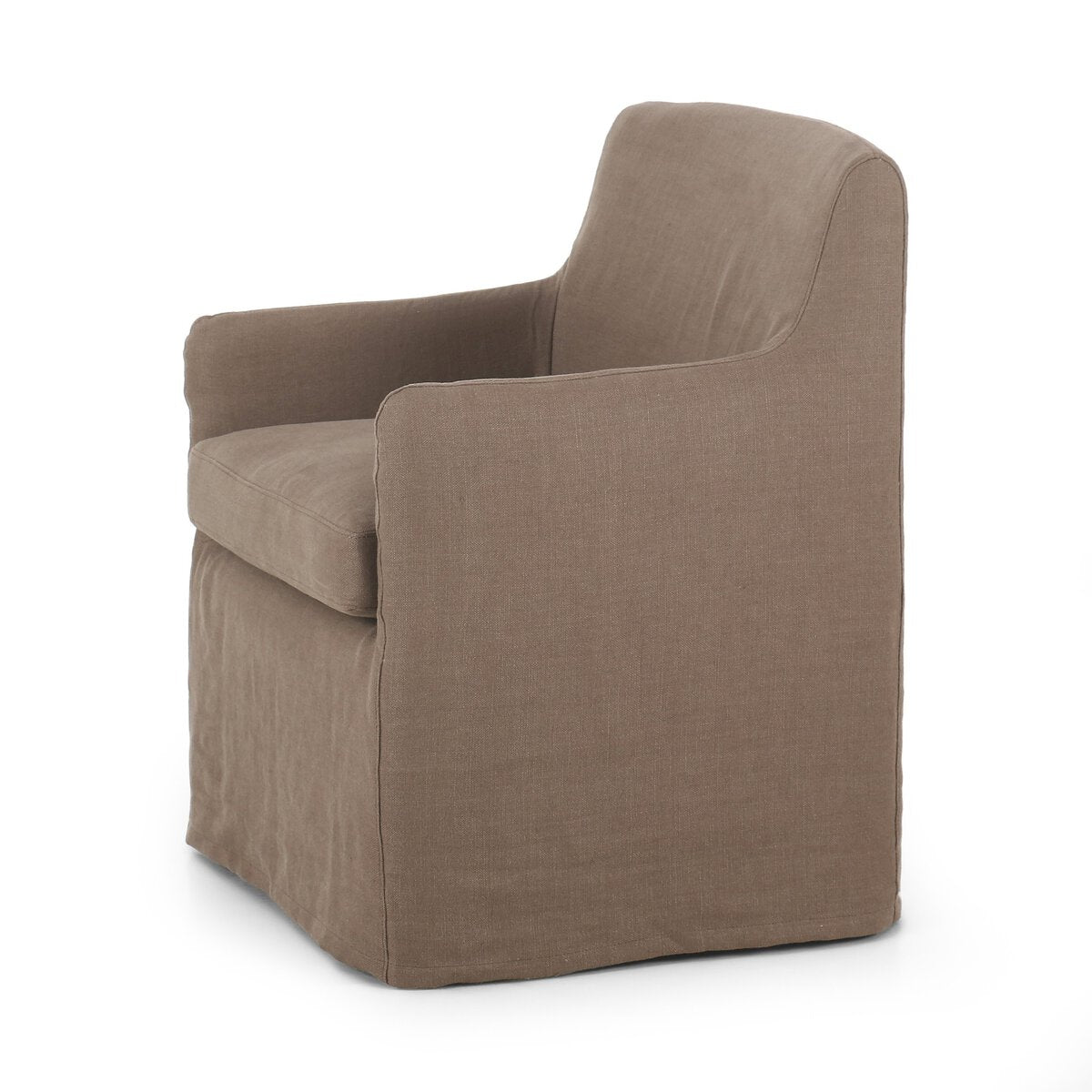 A classic slipcovered dining chair in an earthy mushroom hue pairs elegance and comfort. With rounded arms and a back height of 35", the chair is taller than the standard size and exudes quiet luxury.