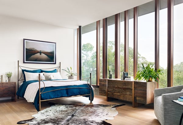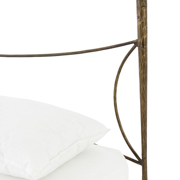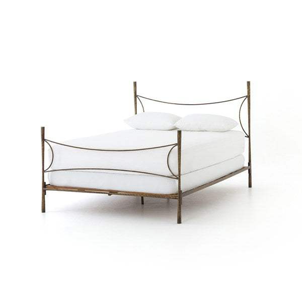 Beguiling curves soften hard materials for marked drama. Slim, hammered iron is finished in antique brass for depth that defies this frame's feminine air. A sculptural-focused design inspired by Swiss artist Alberto Giacometti. Low-profile box spring recommended.