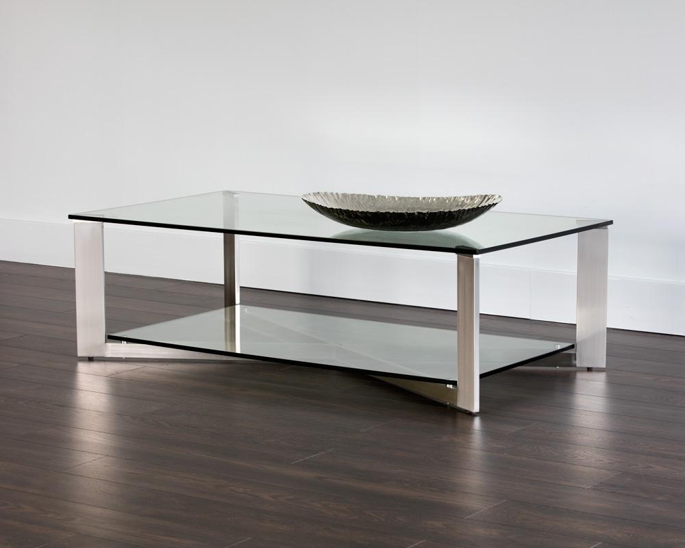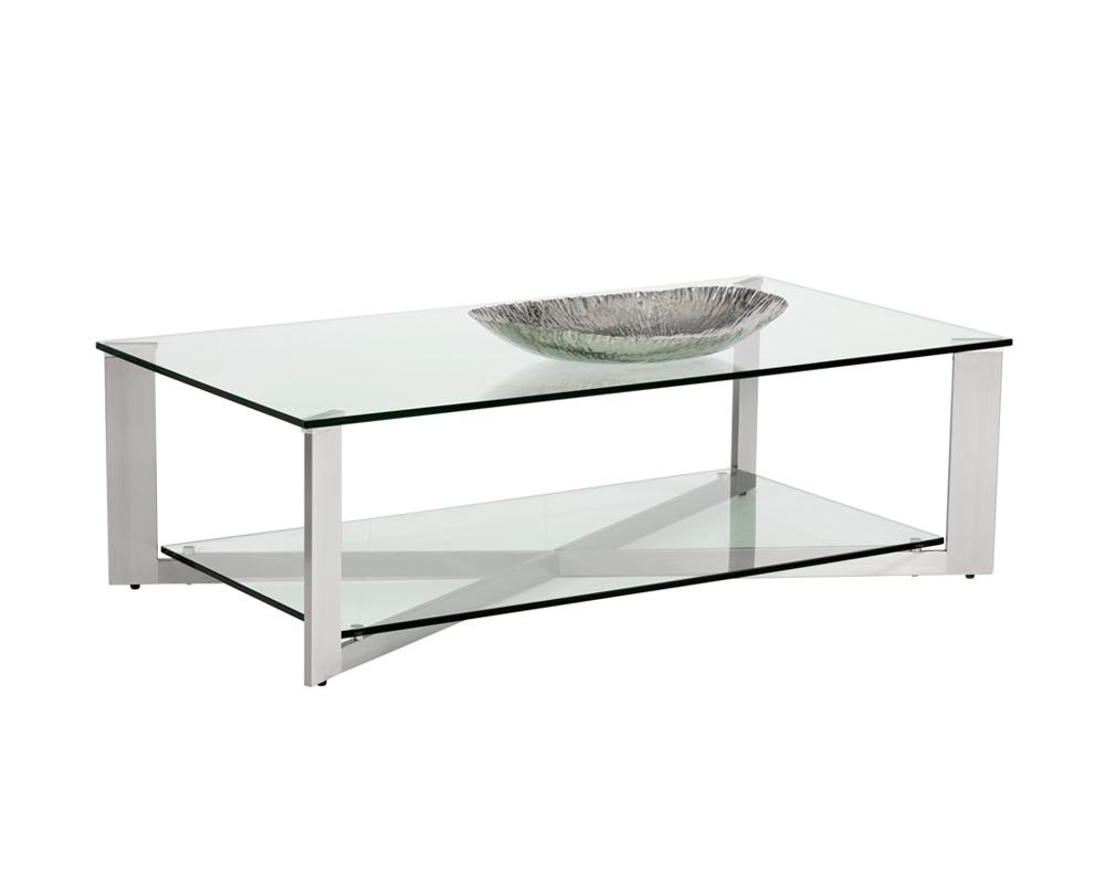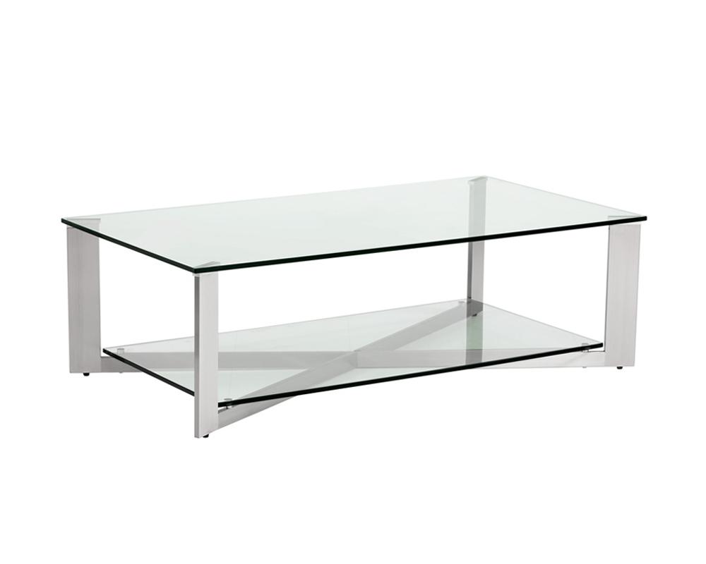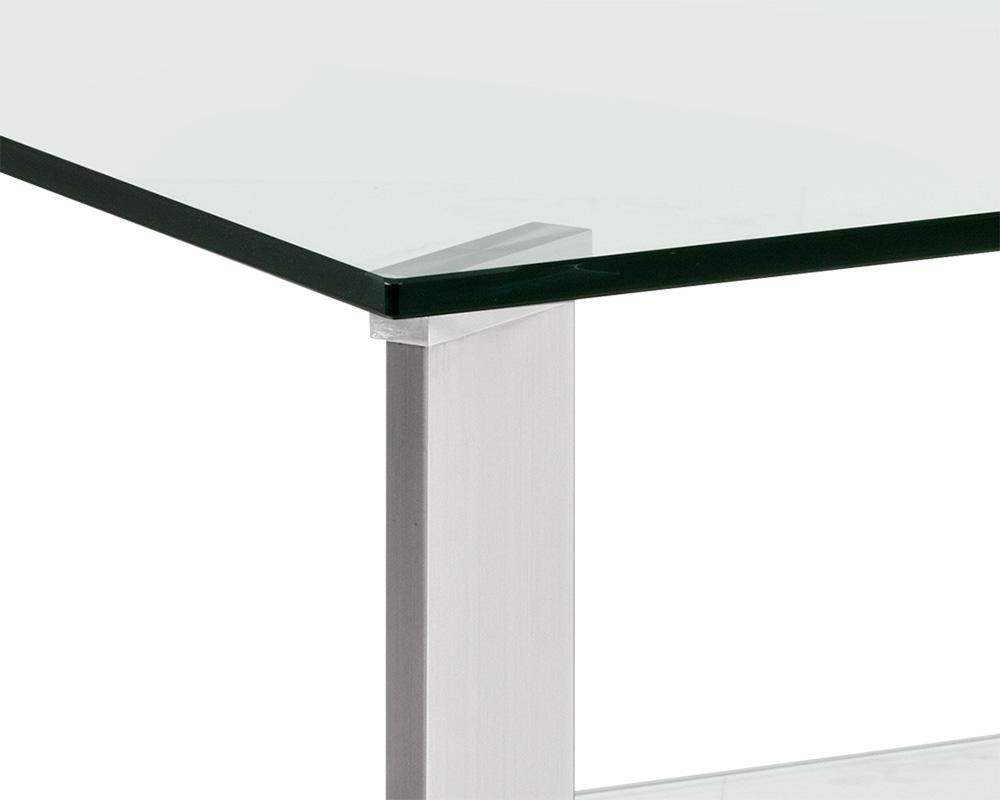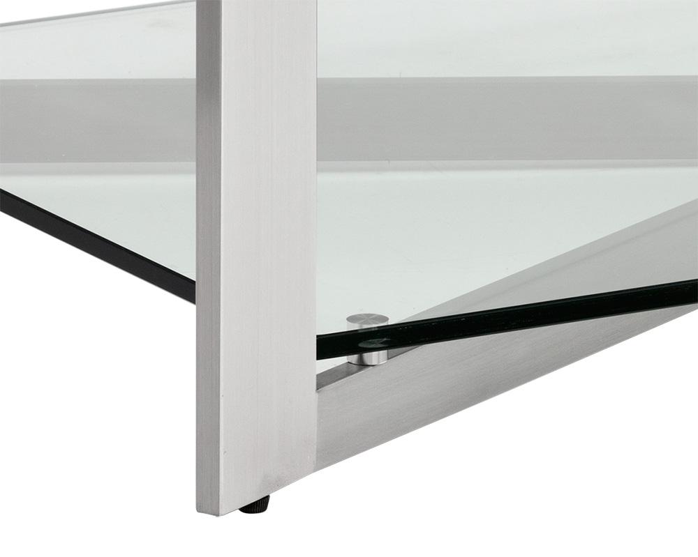 A sleek and modern rectangular coffee table from our Ikon collection. Made with a tempered glass top and bottom shelf perfect for displaying decor and accents. Finished with a brushed stainless steel frame.